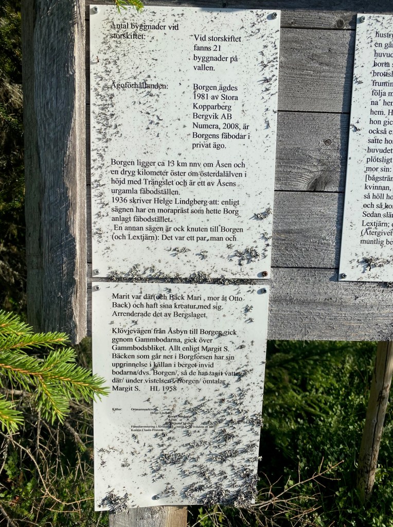 I augusti 2020 fick jag för mig att göra ett besök i Borgens fäbodar i Älvdalen. De ligger ca 2 mil norr om Åsen och Brunnsberg. Borgen är en gammal långfäbod till Åsens by. Sägen säger att en Morapräst vid namn Borg gett namn till fäbodstället.