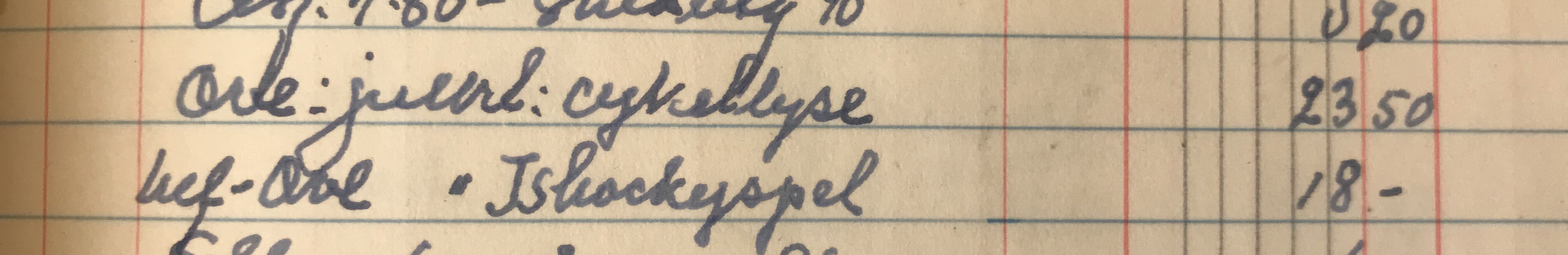 Jag blev så glad att jag blev yr och nästan svimmade minns jag, sju år gammal. Här är kassaboksanteckningen, 18 kr gick det på. I dagens penningvärde ca 260 kr. Billigt kan tyckas. Kollat omvandlingstabell.