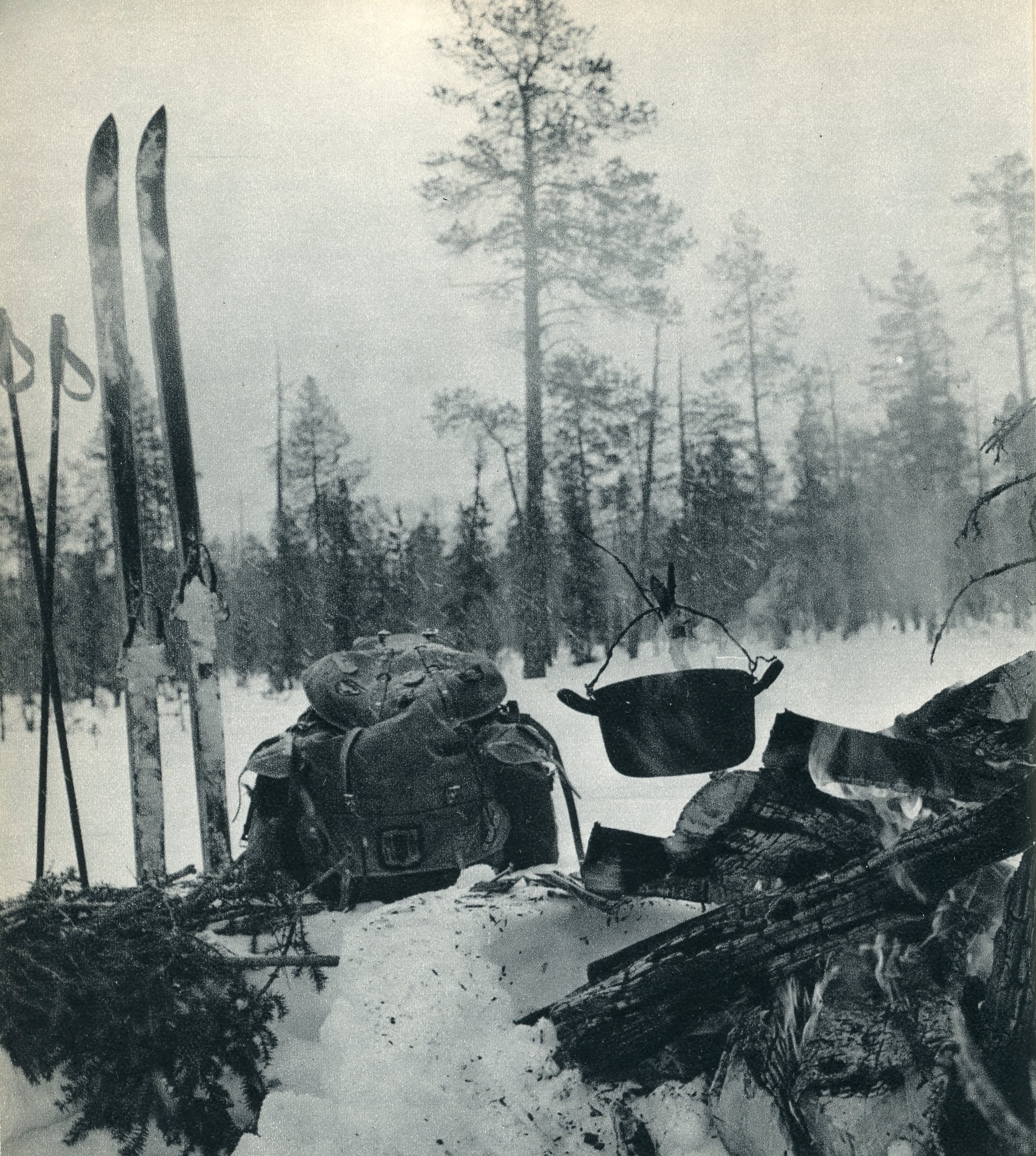 Apropå Peter Krott som blev så förtjust i Stora Höktanden så kan vi ta två bilder ur hans bok. På den första ser det ut som om han är på väg mot Högtanden, även om den borde vara mer kal, kanske en annan höjd. Den andra bilden visar dåtidens utrustning för en längre skidtur.
