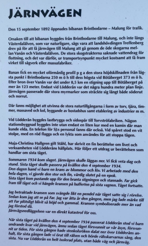 Vi fick höra talas en by eller fäbod/plats som hette någonting med Lödde…. Det skulle finnas några husgrunder kvar och knappt det. Platsen skulle ligga borta mot Brintbodarna. Vi hade inget för oss och kvällen såg ut att bli fin – så vi bilade iväg mot Södra Venjan eller Söromsjöbygden som är ett mycket vackrare namn. Där skulle platsen ligga. Vi är inte i Brintbodarna så ofta, där passerar man ju bara när man åker åt Vansbrohållet. Vi åkte runt lite och letade efter spåren av gamla järnvägen mellan Brintbodarna och Malung. Vi hade nämligen googlat lite och räknat ut att platsen vi letar efter bör vara Lödderåns anhalt. Ett litet samhälle som byggdes upp efter det att järnvägen byggts mellan Brintbodarna och Malung. Banan öppnades för trafik den 15 september 1892. Vi åkte som sagt runt på lite sightseeing i Brintbodarna och grannen Finnbodarna innan vi åkte på vägen som byggts på den gamla banvallen mot Malung.