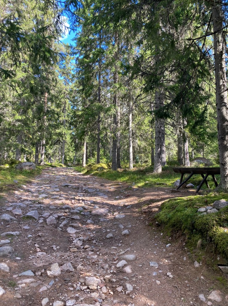Nerfärden tog sin början och vi gick fägatan där det såg ut som att djuren lämnat fäboden. En fäbodstig där vi ledde cyklarna tills det ljusnade i kogen, grusvägen med vändplats. Inte lång tramptag i 4-5 km. Sen kom vi ner till en större väg som gick utmed Oreälven.