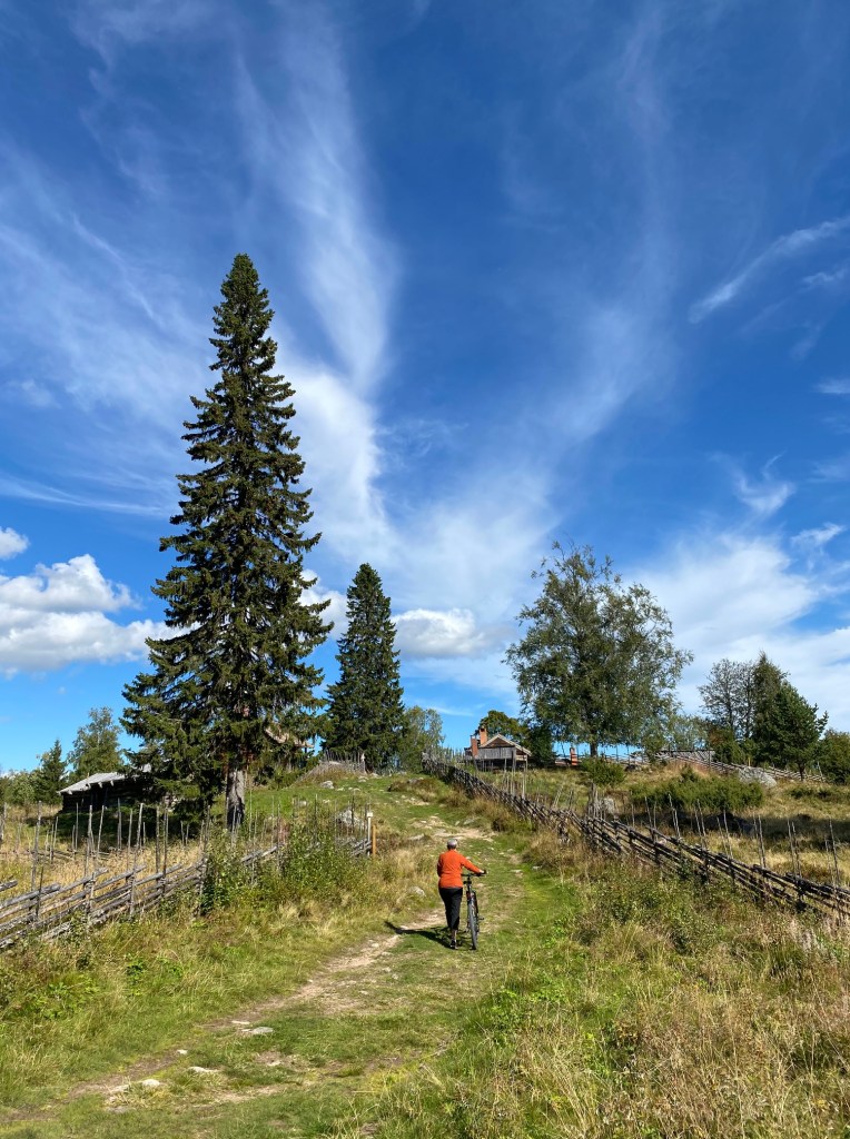 Vi gav oss iväg i motluten mot Ärteråsen, grusväg i gott skick men hyggligt uppför. Vi kom fram till parkeringen och därifrån fick vi leda cyklarna upp till fäboden. En stenig väg, men kort.