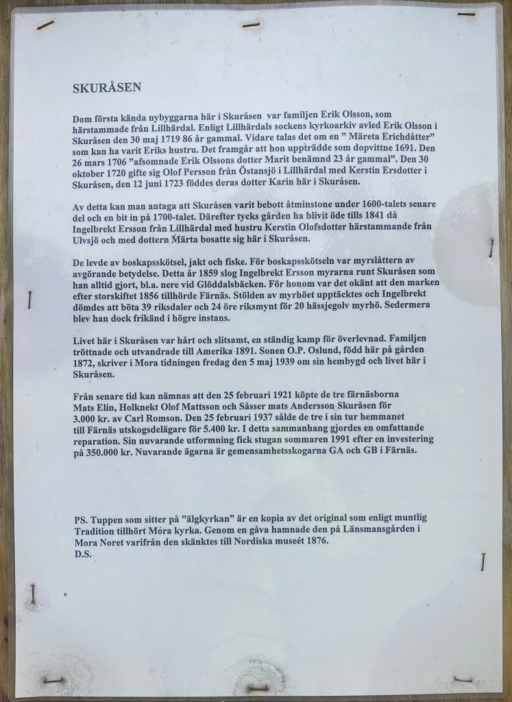 Strax vid Skuråsen, en plats med lång historia, bebyggt i olika omgångar från sent 1600-tal. Se informationstavlan nedan.