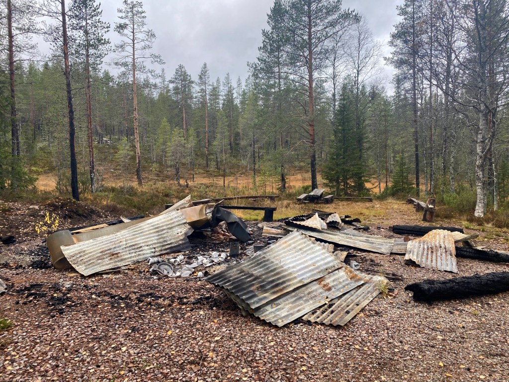 Tyvärr måste vi ta en tråkighet till, på vägen finns en stickväg till Landledaråsen och en övernattningskoja på höger sida några hundra meter från min färdväg. Kojan brann upp för något år sedan, oförsiktiga campare hade nog misslyckats med eldningen på något vis.