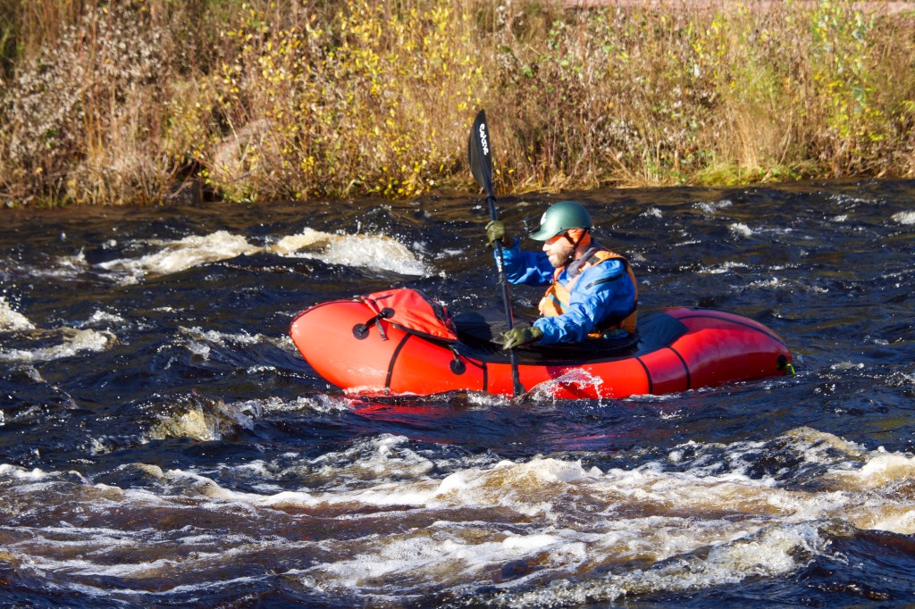 Vi såg något som kom farande uppe i älven runt kröken. Måste vara paddlare av något slag. Mycket riktigt, ett par som trotsade strömmarna och paddlade nedströms, något annat vore omöjligt. Det blev att ta fram kameran.