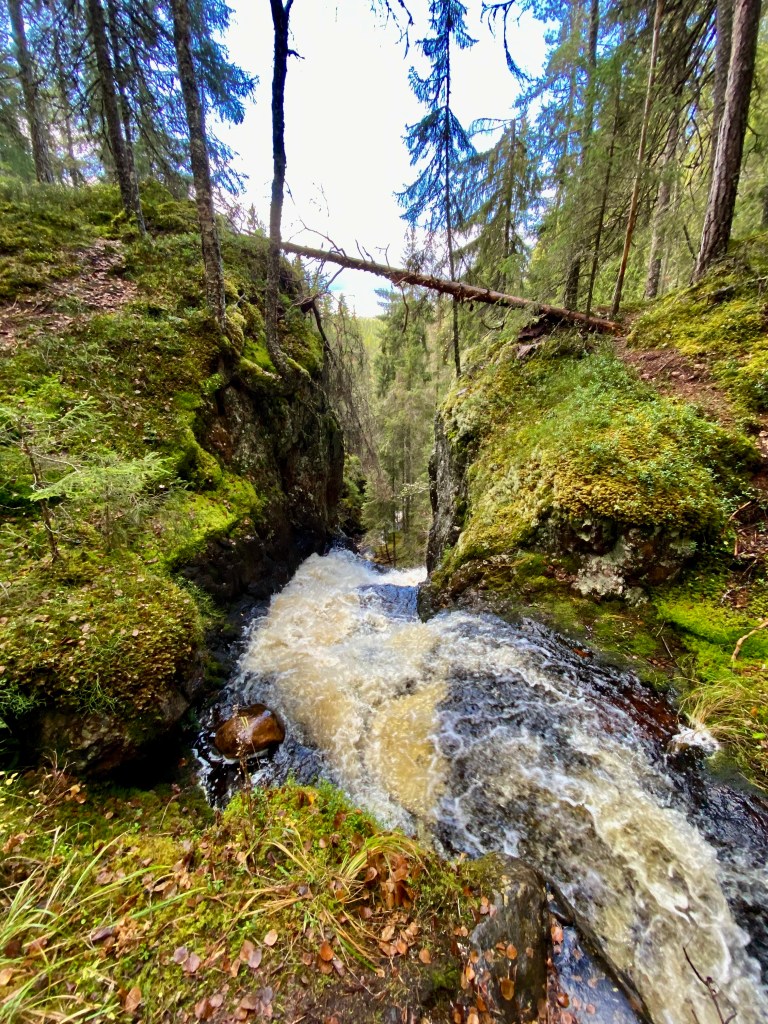 När vi närmade oss Ribbåsen ville jag gärna återse fallet i Ribbåsbäcken. Stigen är ju så bra märkt ner dit. Tidigare kom jag och Anders Bälter nerifrån stora vägen. Ett häftigt fall är det, 22 m fritt fall. Mycket vatten och ett väldigt brus. Men kom ihåg att det inte finns några säkerhetsräcken vid fallet. Så om ni ska unga personer med, barn, eller ännu äldre än mig och Christina, så ta det väldigt försiktigt.