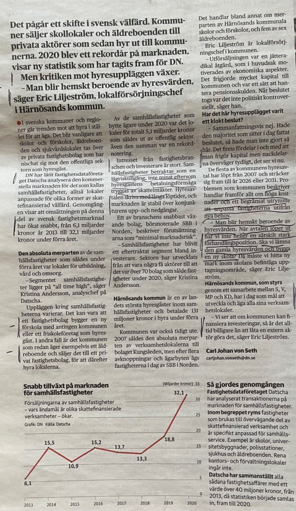 I ett bra läge, tycker jag, kom en stor artikel i DN den 28 maj i år. Den behandlar frågan om hyra eller äga sina samhällslokaler. Rubriken var ”Kommuner säljer lokaler för att hyra dem i stället”. Det gäller både nybyggnation av lokaler som exemplet i Mora och övertagande av befintliga lokaler som kommunen sedan ska hyra.