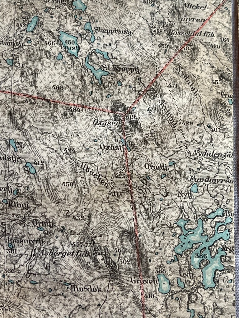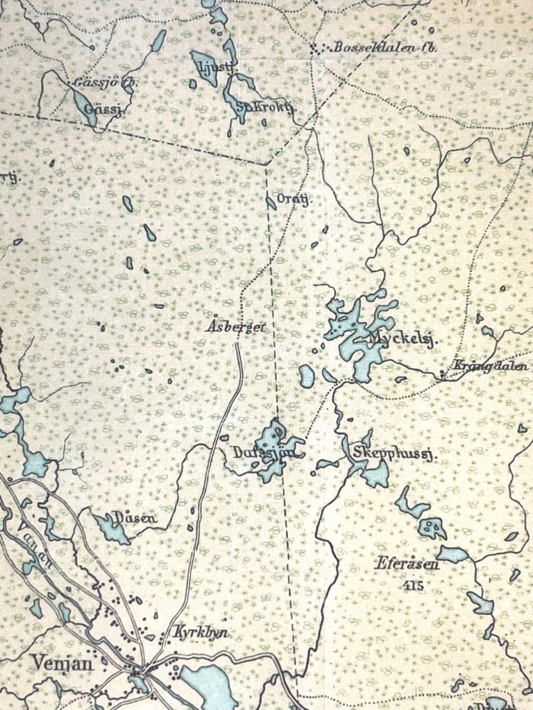 Jag har varit till Åsberget många gånger under de senaste åren. Det är så fint däruppe med utsikten västerut. När vi gått runt däruppe har jag ju sett skylten med en pil mot Bosseldal som är fäbodar i Älvdalens kommun ganska nära Evertsberg, även nära Oxberg. Numera mer en ”jaktcentral”. Jag har cyklat förbi där några gånger, drygt! När jag läst olika böcker/skrifter om gamla händelser så dyker den här gamla leden upp emellanåt. Likaså på kartor som är flera hundra år gamla. Särskilt stort blev intresset när jag läste Karl den XI almanacksanteckningar från sin resa 1686 då han inspekterade gränsen mot Norge som väl låg i Härjedalen/Jämtland på den tiden. Karl red med sitt manskap hem via Lillhärdal och åt lunch i Ulvsjö. Därefter red de ner till Älvdalen där han bodde på prästgården och bevistade ett bröllop. Dagen efter red de till Evertsberg och vidare till Lima över Venjan. Då torde de ha färdats leden jag pratar om.
