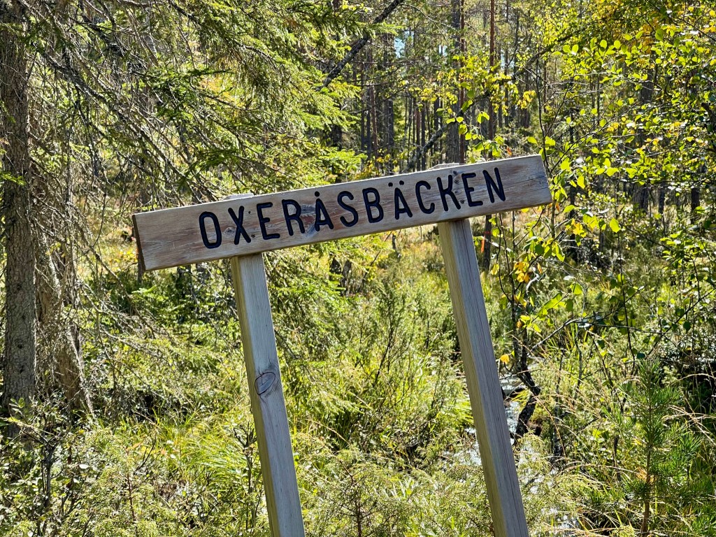 Efter cirka 3 km kom man ut på en väg, det såg ut att man skulle gå den en bit. Men det dök inte upp någon skylt till höger dit jag ville gå. Jag gick en bit men insåg enligt min GPS att jag började komma för långt, för nära Oxåsen. Jag vände och chansade lite, såg ett vattendrag några hundra meter till höger och jag tänkte om jag följer det så måste ju leden gå över någonstans. Mycket bra tänkt, efter ett tag såg jag en bro och leden. Vattendraget var mindre än jag föreställt mig, men vad gjorde det, Oxeråsbäcken hette vattnet.