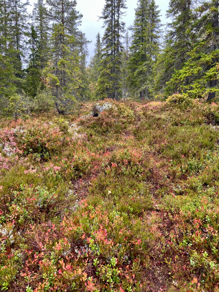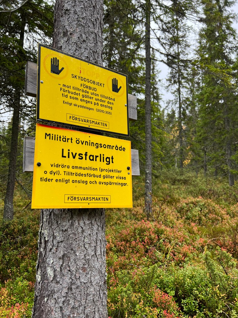 Innan jag nådde vändplanen stötte jag på två jägare som satt och drack kaffe. Tänkte att nu är det kört med den turen. Dom och fler jägare var ute med ett stort gäng hundar, ca 20 st, och gjorde jaktprov. Hundarna höll till mer sydväst och lät mig hållas då jag skulle åt motsatt håll. Jag parkerade vid vändplanen och tänkte jag skulle få gå på GPS:en, men det hade åkt fyrhjulingar uppöver i min riktning så jag följde deras spår. Det var perfekt, efter en knapp km kom jag fram till skjutfältsgränsen. Sen var det bara att knalla höger upp på högsta punkten. Bra nog till motlut var det, jag skulle upp på 760 m.ö.h. Några bilder från starten.