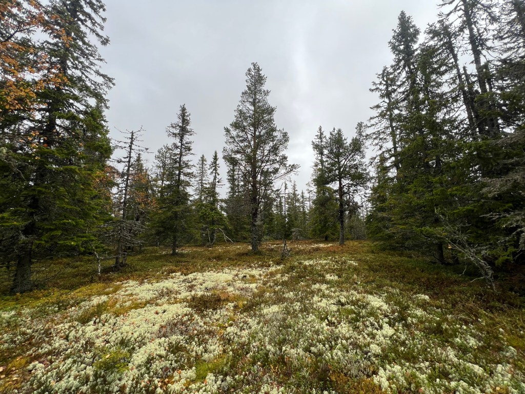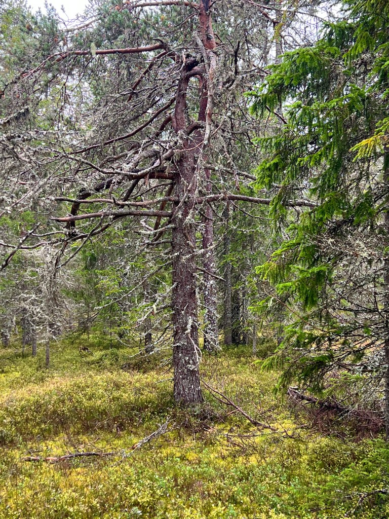 Däruppe och på vägen stöter man på gammelskog och torrakor. Träd som varit utsatta för skogsbränder var många.