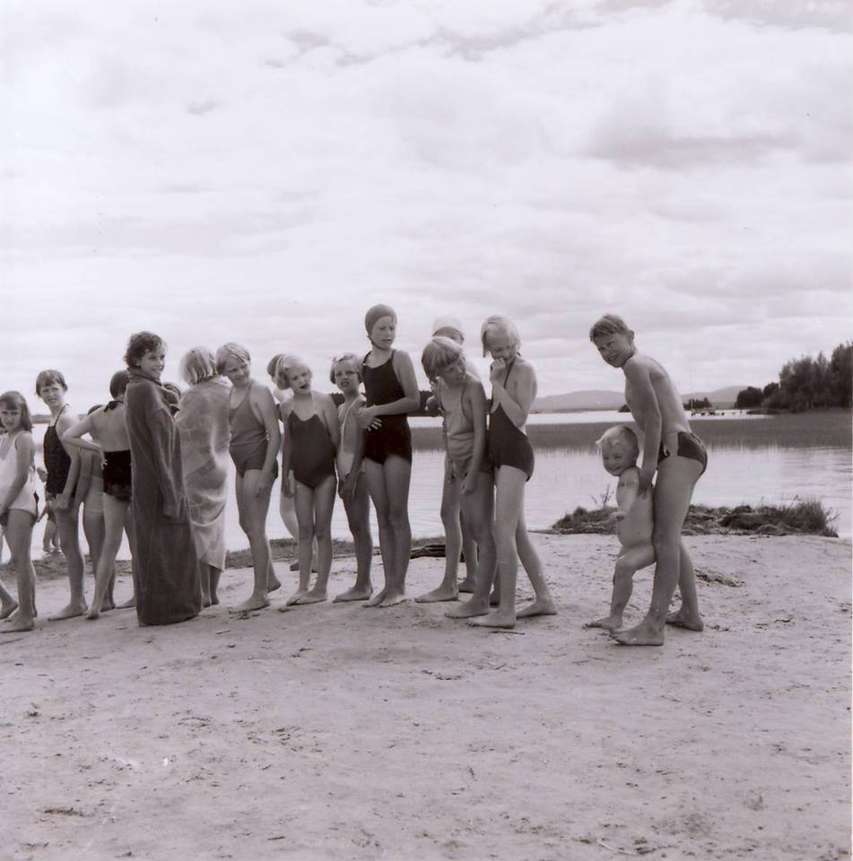 Vi tar några fler badbilder. Simskolan var som sagt populär och på en bild tror jag självaste badmästare Böhlmark från badhuset är med. Han hade vi ibland lite otalt med nere på badhuset och 12 m bassängen.