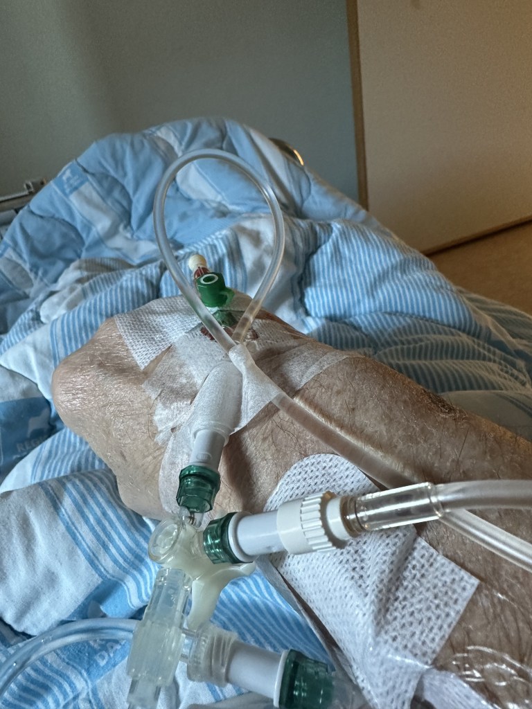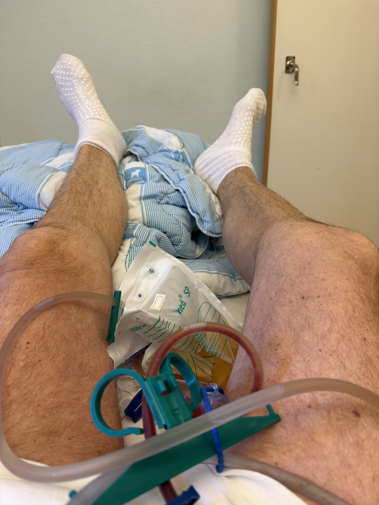 Jag hade ju eget rum och det var helt enkelt tvunget. De kommande dagarna fortsatte att vara en mara. Hemskt illamående och ont och ingen morfin fick jag längre. Det hindrade magen att komma igång. 5-6 slangar med dropp, kateter , dränering m.m. underlättade inte dagarna. Ingen mat naturligtvis. Bara 1,5 av de två sista dagarna för hemgång.