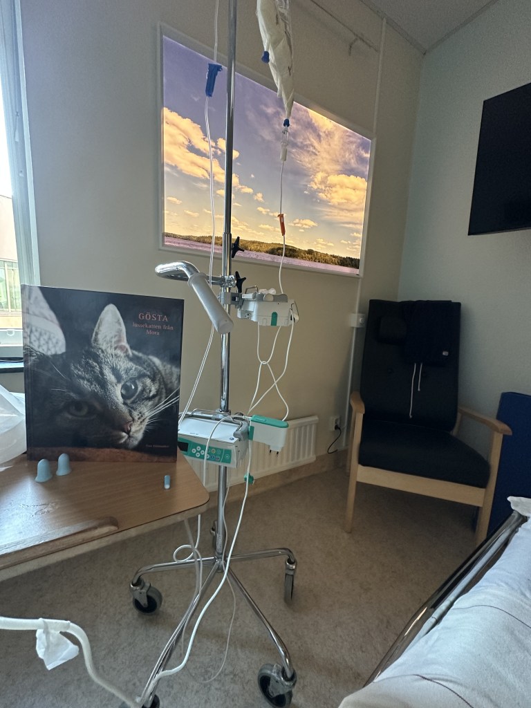 Jag satt i god tid i väntrummet och måste säga att på alla platser jag besökt på lasarettet i samband med ”tumörhelvetet” så har det varit lugnt och stillsamt. Förvånande lite folk, besökare och personal. Men dom är väl på andra avdelningar. Hon var skicklig att sätta dropp järnspecialisten. Jag fick sitta ca 20-25 min innan påsen var tom. Det var tydligt inte blod som jag trodde, utan ferretin/järn. Efter en kvart kom en till kund och satt sig bredvid. Han pratade om att han låg på gränsen till anemi (blodbrist). Han hade HB 125. Jag nämnde inget om mina imponerande HB 112. (vad göra han där tänkte jag). Men allt i den här branschen är ju individuellt.