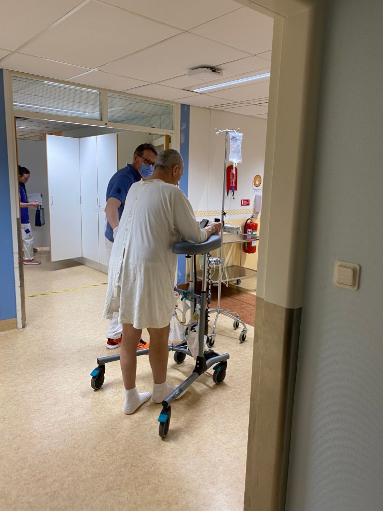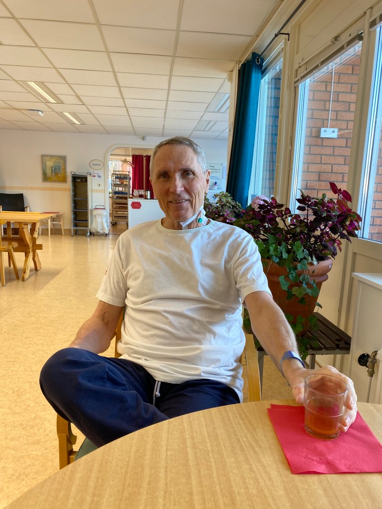 Räddningen var Christina som dagligen kom på besök, förutom en dag då jag inte orkade se någon. Även brorsan Ulf och dotter Lisa gjorde flera besök och lättade upp det hela. Peppning på messenger av andra. En trevlig och nyttig man var Kjell. Sjukgymnasten som såg till att jag kom upp ur sängen och kunde gå lite i korridoren. Det behövdes för att kroppen skulle komma igång. Under de sista dagarna fick jag följa honom upp till 9:e våningen och ta några bilder. Hans ”domäner” med gympasal m.m.