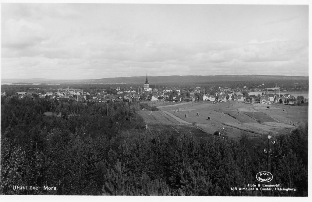 Jag tog en tur upp till Spanskvägen och tittade ner mot Mora och kyrkan. Om man stod ungefär vid f.d. Guttormsens villa så blev vinkeln på kyrkans tak exakt som på de gamla bilderna. Med skarpa ögon kan man se det på bilden nedan.