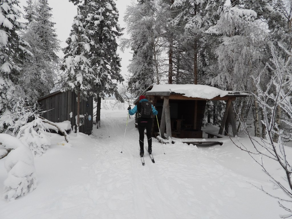 Vi hade kommit in på hundspannsspåret och såg Tunturi framför oss. Där finns slogbod och det borde vara läge för fika där.
