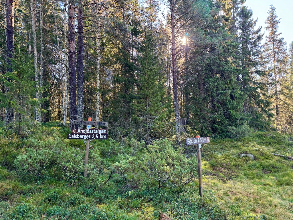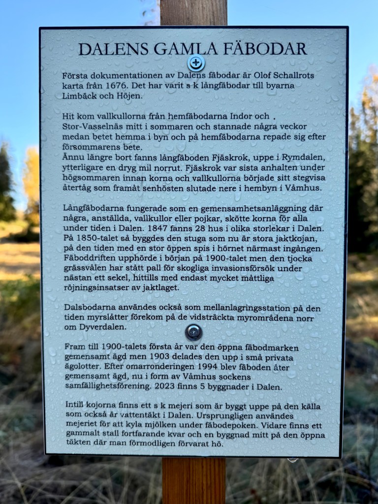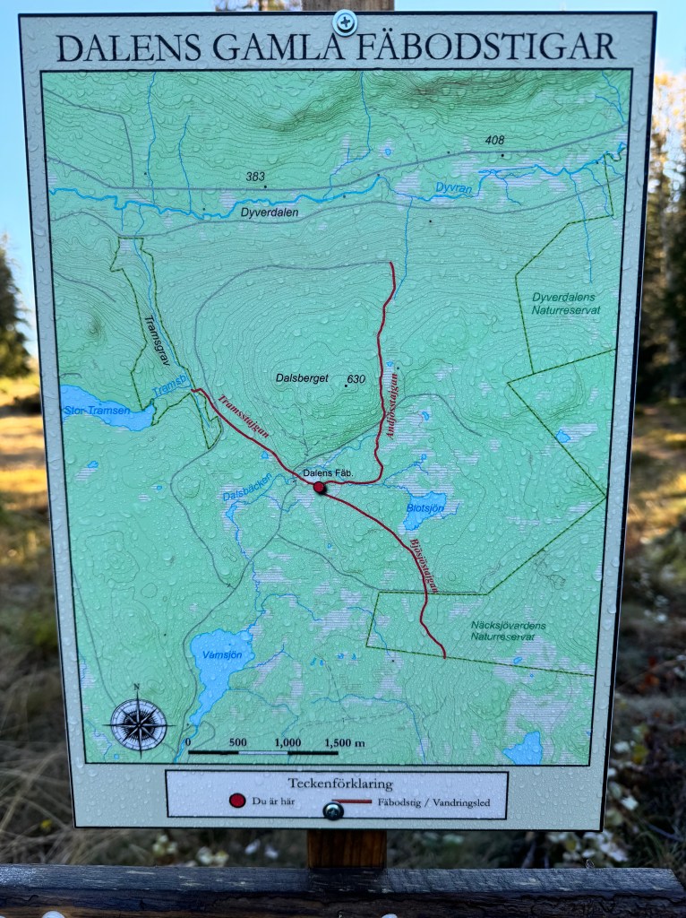 Jag fick information av Lars Ambrosiusson att han och fru Inga-Britt hade letat rätt på gamla fäbodstigar däruppe. De är numera nymärkta och det fina är att Lars föräldrar, Britta och Lennart märkt upp stigarna på 70-talet. Lars gav förslag på hur vi skulle gå för att även få med naturreservatet Tramsgrav på rundturen. Vi kan kalla den Dalenturen. De nymärkta stigarna presenteras vid parkeringen vid Dalen. Likaså information om fäbodarna. Fäbodstigen åt Bösjöhållet, Bösjöstaigen, är även den nymärkt.