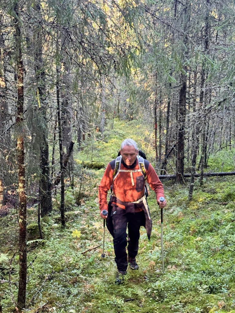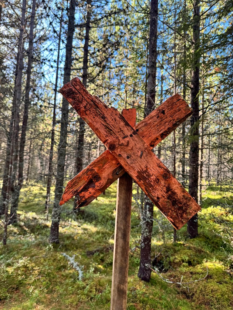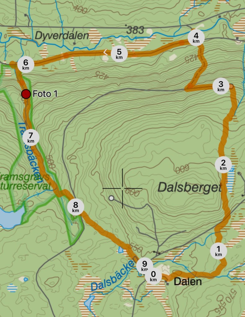 Det stod inte på vi skulle över en mindre bäck. Vi fick passa oss så att vi blev blöta så direkt. Det hade regnat dagarna före så bäcken var lite strid. Vi hittade en plats där vi kunde ta ett rejält kliv över. Det var så bra märkt bortöver i sluttningen på Dalsberget. Ibland såg man någon äldre målning som kanske Lennart, min gamle arbetskamrat fixat, eller fru Britta. Vi gillade terrängen, lagom ojämn och mjuk. Bra motion för oss med lite årsringar.