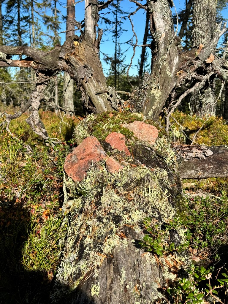 En annan öppen terräng väntade oss och vi närmade oss målet för vandringen. I Tramsgraven varvades gammelskog med yngre och markvegetationen var häftig med ormbunkar och allt vad det kunde vara. Inget man har hemma i trädgården i alla fall. Vi mötte nu på en riktig gammeltall, från Gustav Vasas tid kanske. Brandskadad och stadigt stående på en smal del av den gamla trädstammen. Ett konstverk med historisk bakgrund.