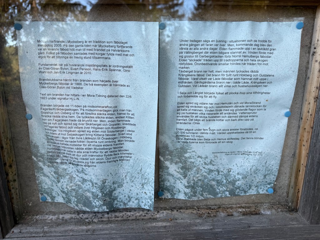 Jag chansade, åkte upp till Myckelberg, hade fått reda på att ristningarna skulle finnas ut med en stig från fäboden. Jag knallade utmed fäbodgatan och letade efter ”stigen”. Visst övergick fäbodgatan i det närmaste en stig, men mer en gammal körväg. Hopplöst att leta där bortöver och jag vände åter till majstångsplatsen. Där fanns förresten en ”utställning” och skogsbranden 1888. Fixad av Bylon med flera, intressant. Ni ser på bilden stubbar från den stora branden som svepte över området 1888. Se text om branden nedan. Förstora så ska det gå att läsa.