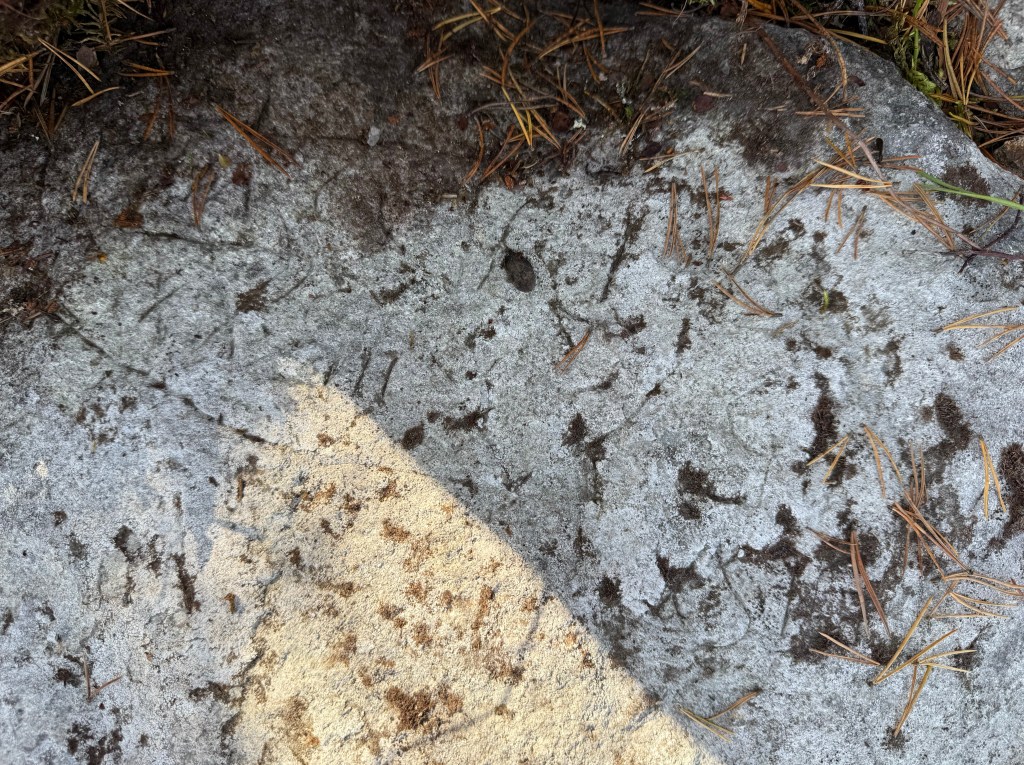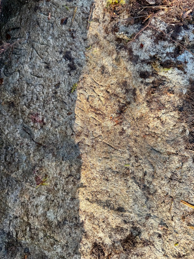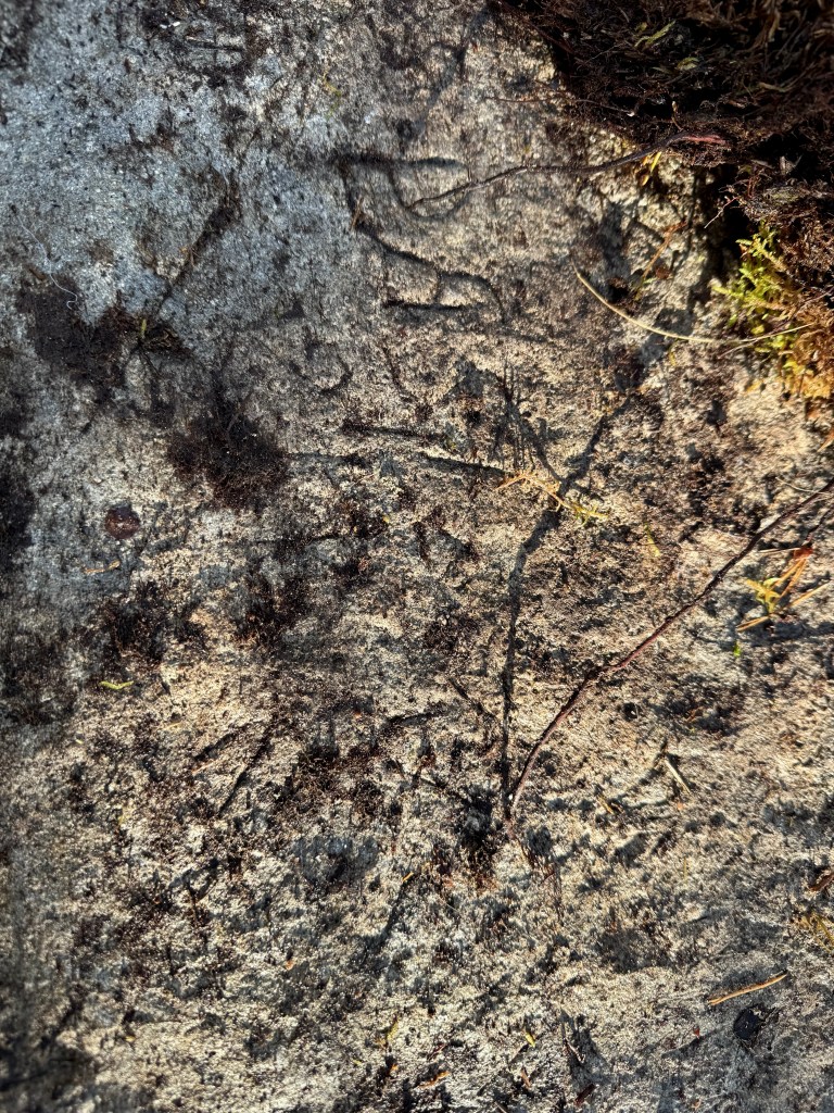 Telefonen ringde, Clas-Göran. Han hade mer information. Ristningarna skulle vara anmälda till Riksantikvarieämbetet. Det har jag missat, min drummel. Jag har appen Fornfynd och hittade den där. Appen fungerade bra och jag gick mot stället där ristningarna fanns. Jag såg riktningen jag gick och det var allt en bit till målet. Men nu var det kört, dit skulle jag. Underlaget blev allt sämre och mer kuperat. Men, jag närmade mig på kartan i appen och i verkligheten. Jag kollade kartan igen och tittade upp. Där framme såg jag en stor klipphäll. Ristningarna var tydliga, även om mossan krupit uppåt på stenen.