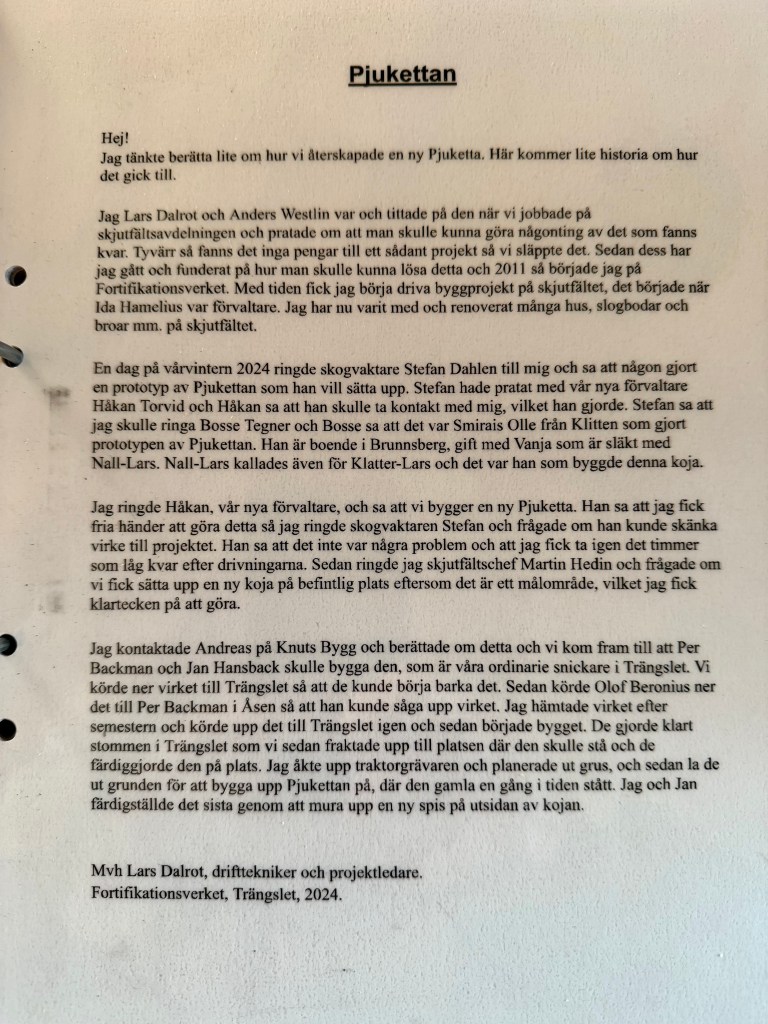Länge har jag tänkt mig en tur till Älvdalens skjutfält för att titta på den nya Pjukettan. Pjuketta, vad i hela friden är det? Jo, det är en riktigt gammal jaktkoja på skjutfältet. Den ligger i närheten av Slängbodarna. Kojan byggdes av Brunnsbergsmannen Nall-Lars. Han var en riktig storjägare och kallades för ”Klatter-Lars”. Han sägs ha skjutit fem björnar och 300 älgar. Jag besökte den udda lilla byggnaden 2021 och då var det bara ruiner kvar. Jag fick via Bosse Tegner höra att en ny ”hetta” byggts upp av fortifikationsverket. Pjuketta betyder toppluva på älvdalska. Den nya kojan måste naturligtvis inspekteras. Skjutfältet hade öppet under veckan och det begav sig en solig morgon från Mora. Några bilder blir det alltid på färden upp.