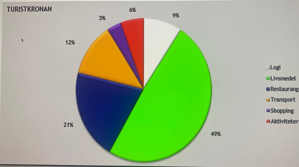 Vi ser att livsmedel tar den största delen av kakan. Det förklaras bl.a. av all genomfartstrafik vi har. Naturligtvis även av ett stort upptagningsområde för handel. Därefter kommer restaurang, transport, logi och aktiviteter. Shopping kommer säkert längre ner än vad många tänkt sig. Sunt och bra tycker jag. Jag har aldrig trott att folk numera åker omkring mellan städer och handlar i samma kedjor som finns i varje ort av hygglig storlek. Inget ont om handeln naturligtvis, vårt upptagningsområde i norra Dalarna gör att vi har ett bra handelsutbud. Men glöm besökarna. Det vi bör sikta på är aktiviteter, då följer de andra parametrarna med, logi m.m.