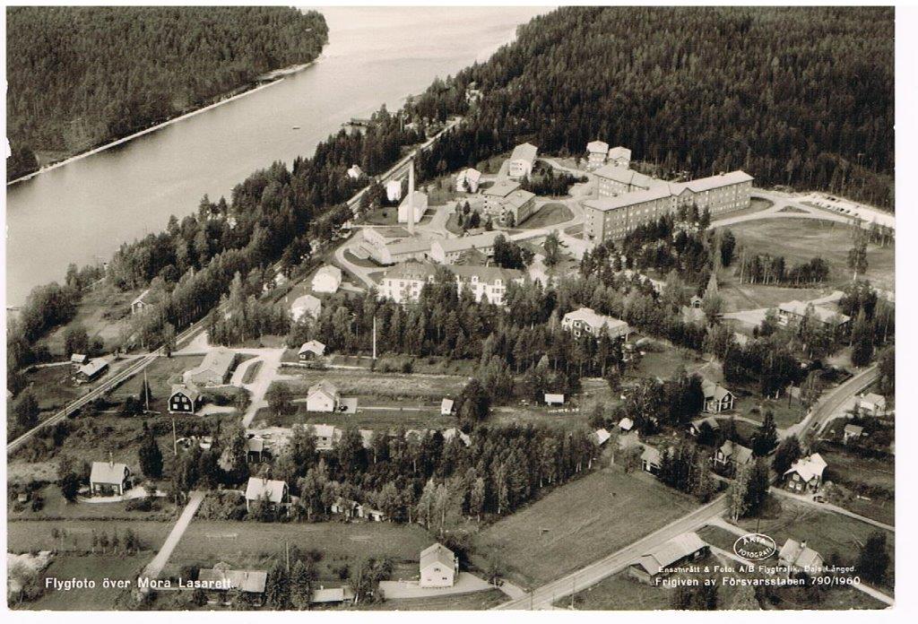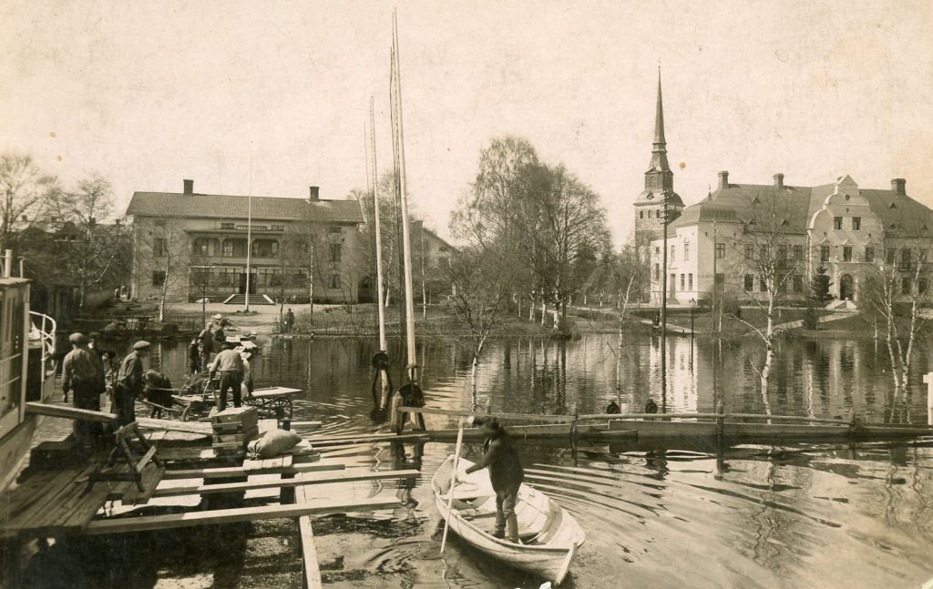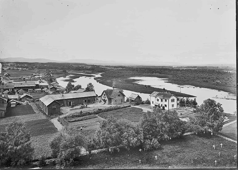 Mora-Noret med flottbron där den gamla Länsmansgården skymtar bland husen. Moras ”centrum”.