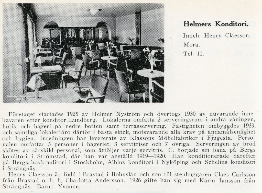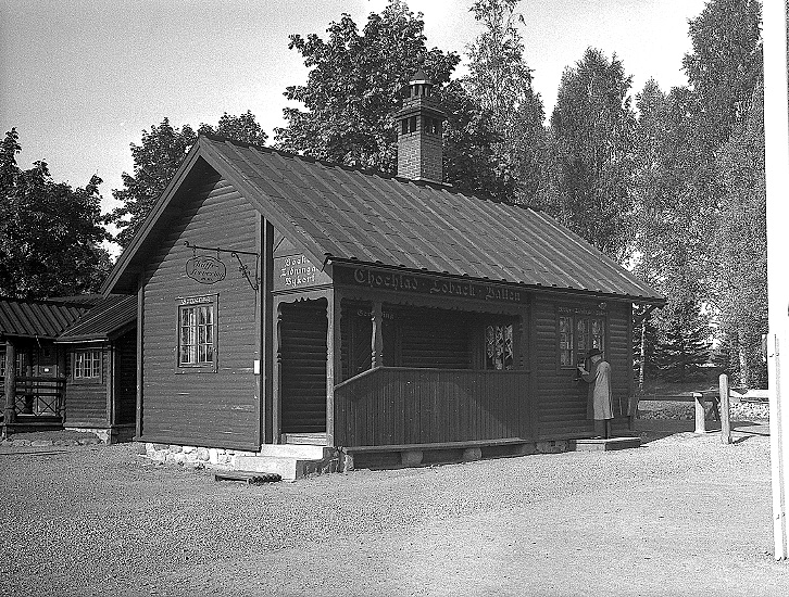 Måste bara visa hur Morastugan ser ut idag. Den står uppe i Jöllen i Älvdalen, bredvid Bössbo fäbod. Om man svänger av över Jöllenbron från Lillhärdalsvägen från Älvdalen och åker mot Navardalen så har man huset snart på höger sida. Stugan flyttades först från Mora till trakten av Hökberg nere vid älven. Spjutmodammen skulle byggas och stugan blev dränkt om den inte flyttades. Så blev fallet och stugan är idag jaktstuga för familjen Barke.Här har kiosken växt ordentligt och Morastugan är kvar. Kaffeservering står det på skylten och reklam finns för choklad, tobak och vatten. Denna byggnad står idag uppe på Älvgatan ihopbyggd med annat hus. Där på Älvgatan bodde en gång Isidor Jonsson, han köpte loss kiosken. Det blev ju en ny byggnad vid stationen 1939 som är kvar idag Järnvägskioskens Pizzeria, för övriga ritad av Isidor Jonsson sägs det.Nya Pressbyråkiosken från 1939Serveringen i Pressbyråkiosken