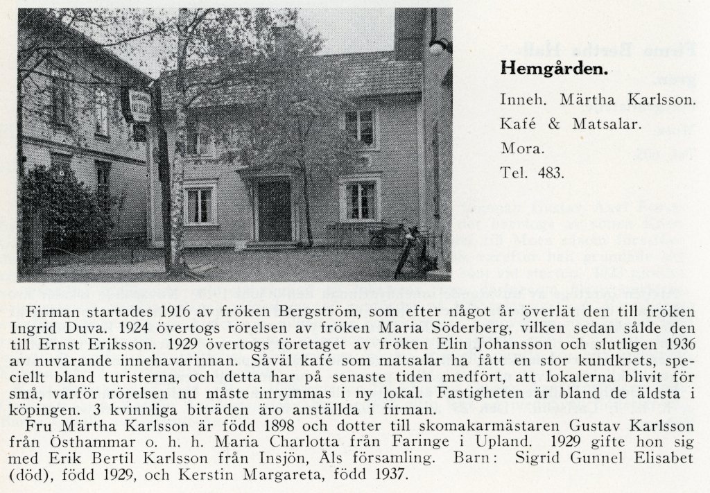 Vi är på väg åt Järnvägsstationen och Mora-Noret. Det dök upp ett till Café. Bergströms vid Älvgatan. Jag läser i Kalle Nyströms bok”…för rättvisa, frihet och bröd” att på det caféer skulle järnvägspersonalen skapa en fackklubb. Det var ”besvärligt” och man smög sig dit från olika håll. De blev få men senare hölls ett möte i Templarlokalen vid Kyrkogatan 1906 och då bildades en avdelning i Svenska Järnvägsmannaförbundet, avdelning 133. Bergströms var både café och rum för resande enligt bilderna.