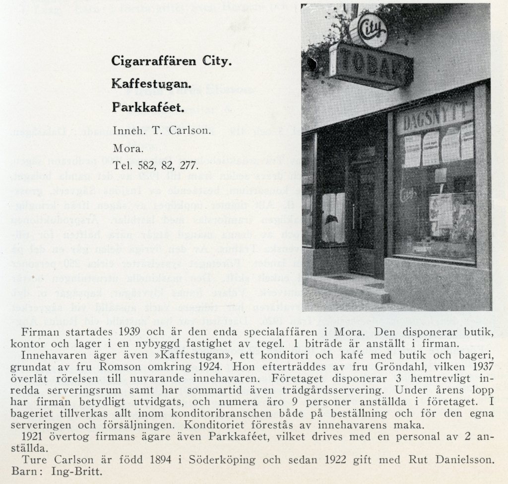 Ett Cafe´som inte får glömmas bort är Cafe´ Röda stugan på Vasagatan. I det lilla huset som är kvar idag har många verksamheter hållit till. Bl.a. hade T Sundström Cafe´ där 1929, telnr 346. Cafe´ har funnits mycket längre fram i tiden, 50-70-talen.