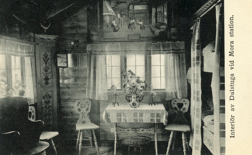 Morastugan eller Dalastugan med den första kiosken på plats. Det sägs att pelarna som håller upp verandan kommer från Mora kyrka när den restaurerades.En idyllisk bild från det fina Cafét, Dalstugan. Välklätt sällskap på besök.Interiör från Morastugan, mycket är kvar än idag i stugan vid Jöllen i Älvdalen.