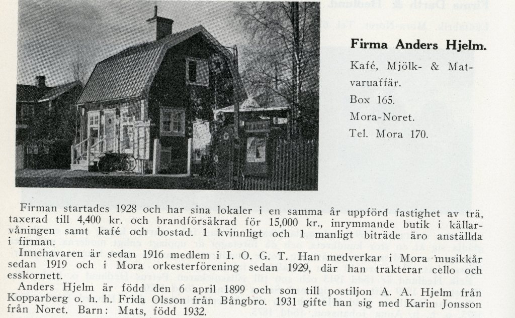 I 1939 år ”företagskatalog” noteras att Anders Hjelm även haft kafé, mjölk- och matvaruaffär på annan plats i Noret. I ”centrum” vid kooperativa, numera Claes Guld & Silver.