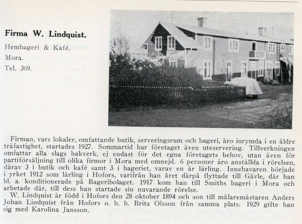 Loos kafé startade i samband med att Mora Lasarett byggdes 1912 av Lisbeth ”Lisa” Loo 1878 -1954 hon blev änka 1926. Lisa hade även Rum för resande, rikstelefon 160 år 1929. Rörelsen övertogs av Ivar Eriksson 1899-1965 och hans hustru Agnes 1903-1974. Under Ivars tid bedrevs bagerirörelse med en anställd Gunnar Olsson från Färnäs. Man idkadekringresande brödförsäljning ( först på cykel sedan med liten skåpbil) och Ivar kallades ” Bull Ivar” i byarna. På flygfotot syns bakom bageriet de bikupor som gav honung till verksamheten. På fastigheten syns ett tvåvåningshus som användes för rum till resande. Kaffekorgar levererades till lasarettets personal och patienter. Ivar och Agnes bodde ovanpå kaffeet. Verksamheten lades ned ca 1960.