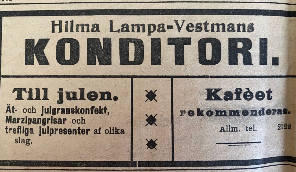 Vi närmar oss slutet av café och konditoriinventeringen för den här gången. Texten ska säkert korrigeras och fler ställen ska läggas till. Kanske ska vi försöka att ge oss i byarna.