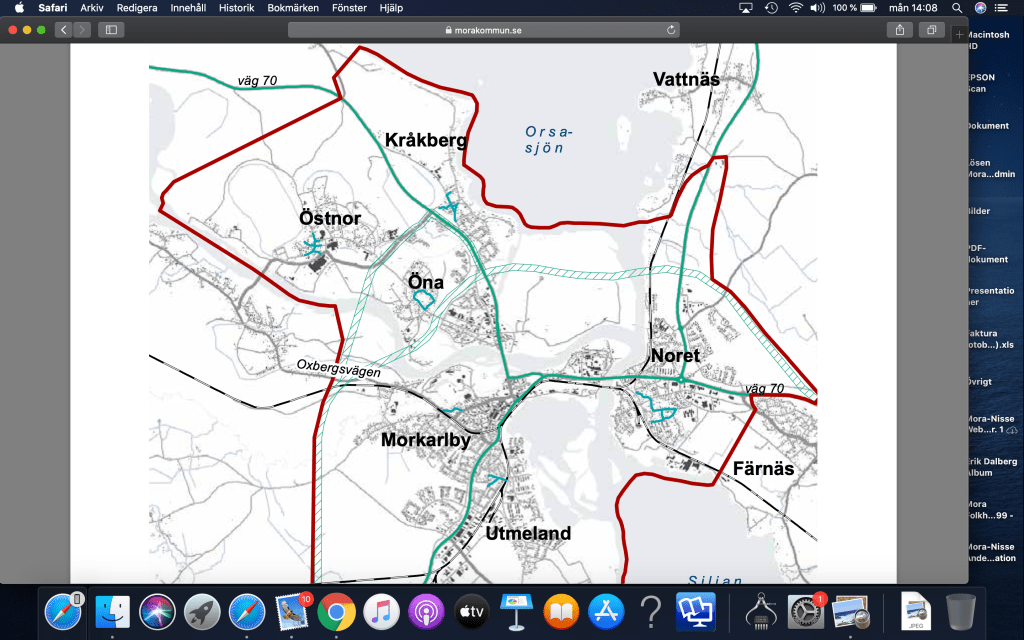 Här tycker jag det börjar ”hetta till”. Vägen kommer alldeles bakom det nya äldreboendet Ekbacken och villorna på området Måmyren. Ny rondell torde det bli. Väg ner mot älven och ny bro intill villorna därnere i den fina tysta miljön. Vägen stör även nya byggnationer åt Orsahållet. En stark störning i ev. framtida bebyggelse.