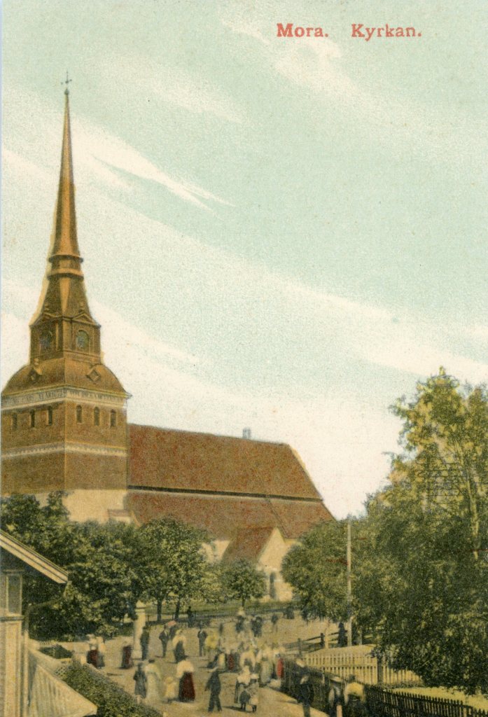 Gammal bild på Mora kyrka med folkliv och grönska.