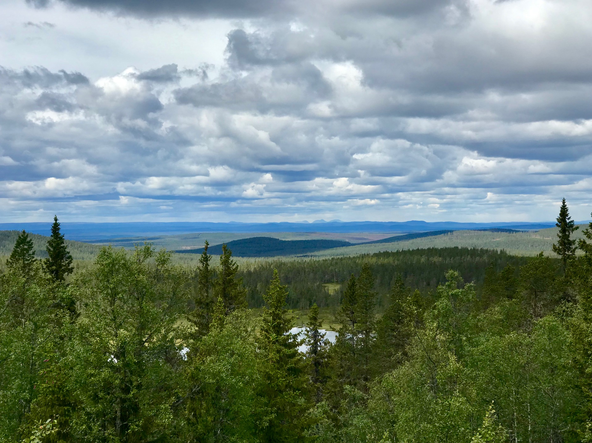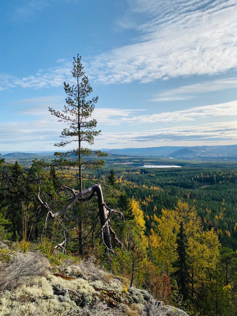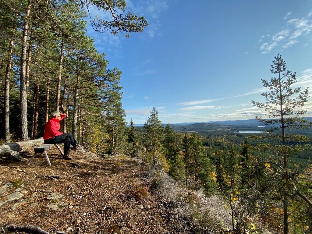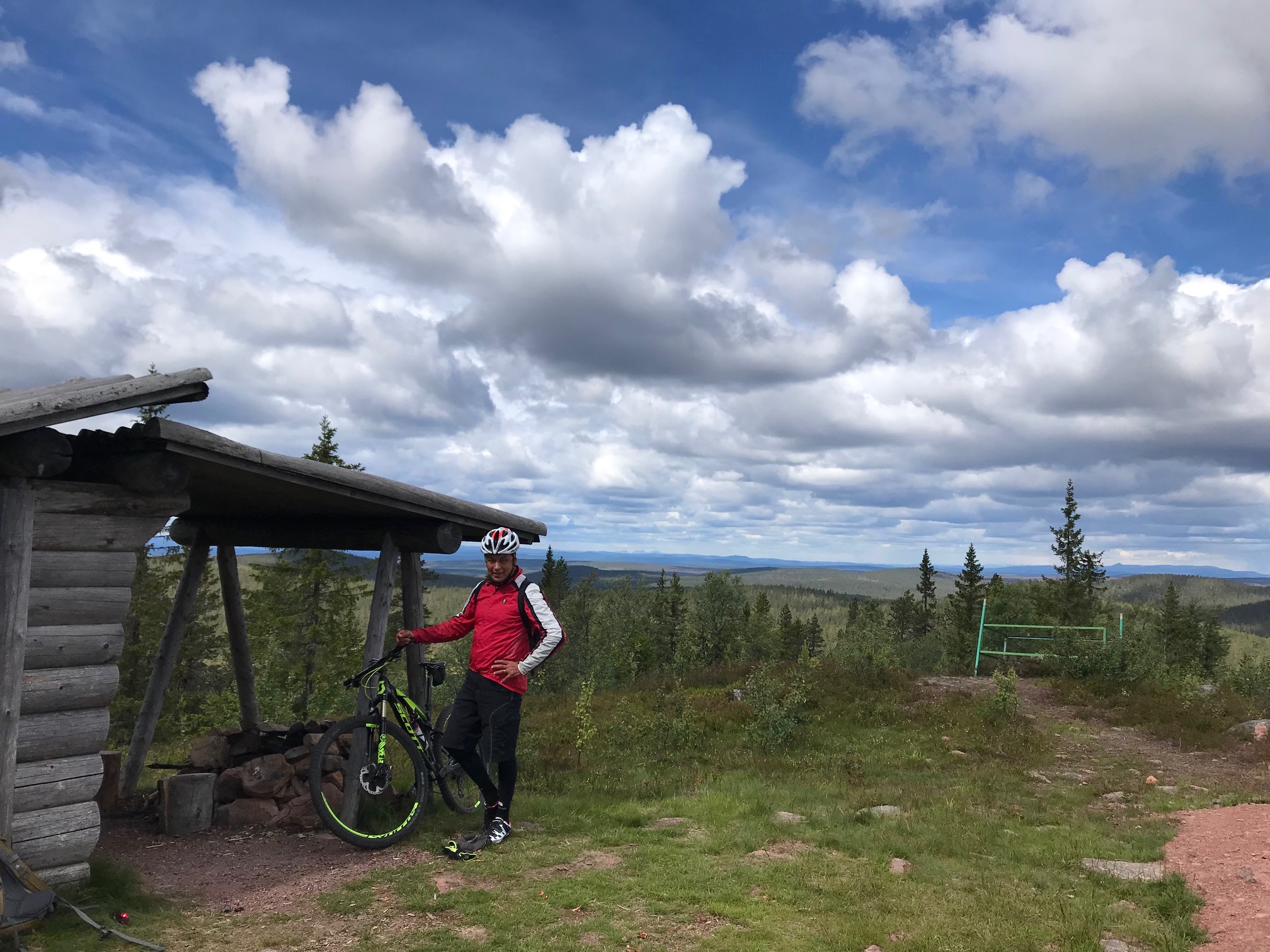 På med cykelskorna, efter en kopp kaffe och en macka. Mot den häftiga utsiktsplatsen Snoddskallen, ordet betyder kalt huvud. En gång var det kalt på den fina höjden, numera kryper skogen uppåt. Min höjdmätare visade i alla fall runt 765 m.ö.h. så visst var vi på skaplig höjd, det kändes förresten i benen. Det blev några bilder naturligtvis, mot Norska fjällen m.m. Spår efter skogsbranden förra sommaren kunde urskiljas.