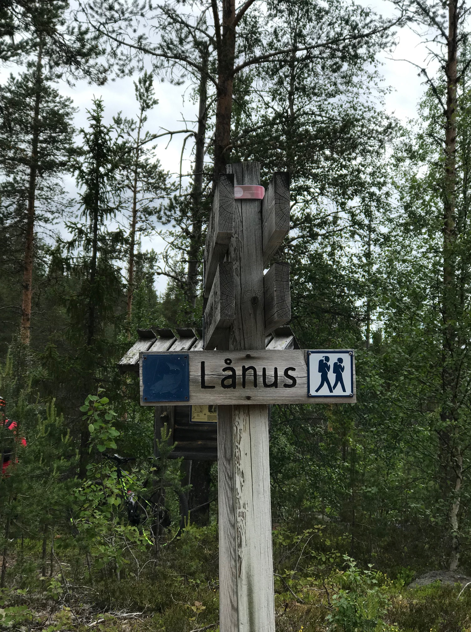 Lokavallen, skylt fixad av Bosse Tegnér. Det röda är Torvald, ingen blomma.Högt, björkarna kroknar. Fjällbjörkar.