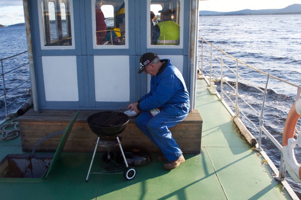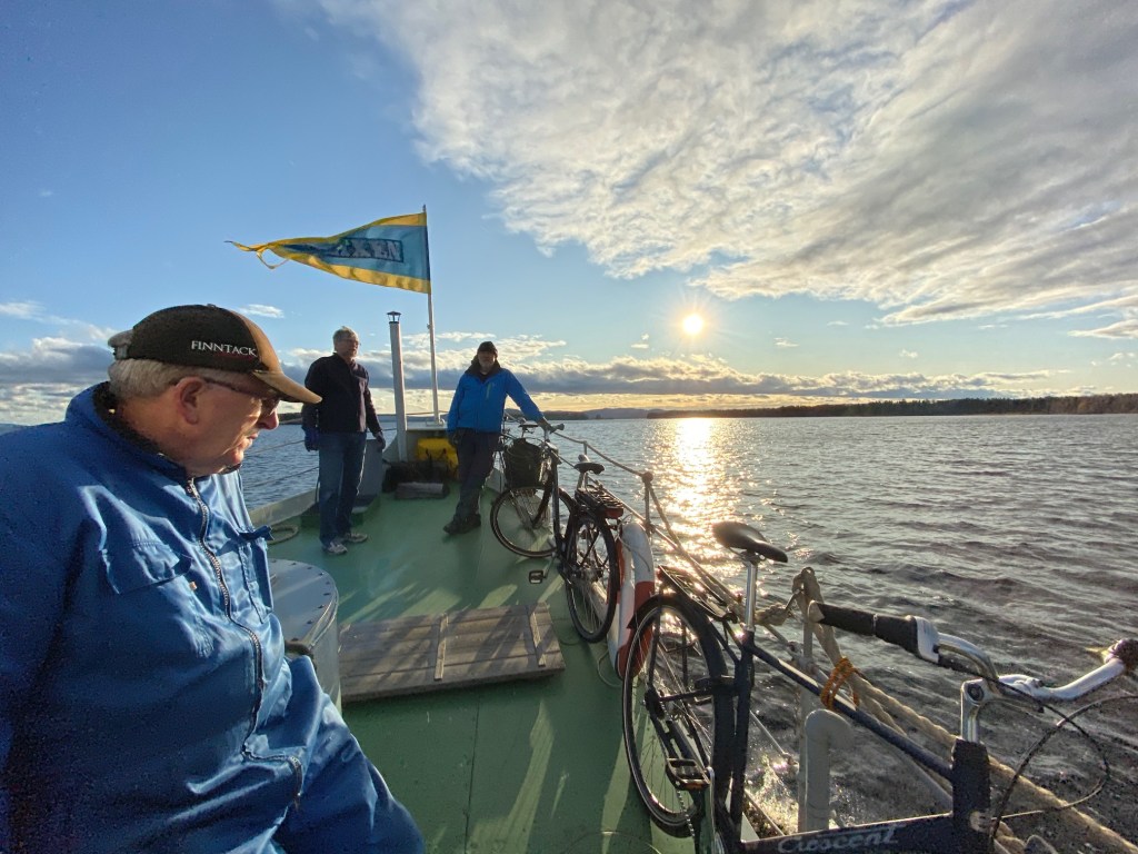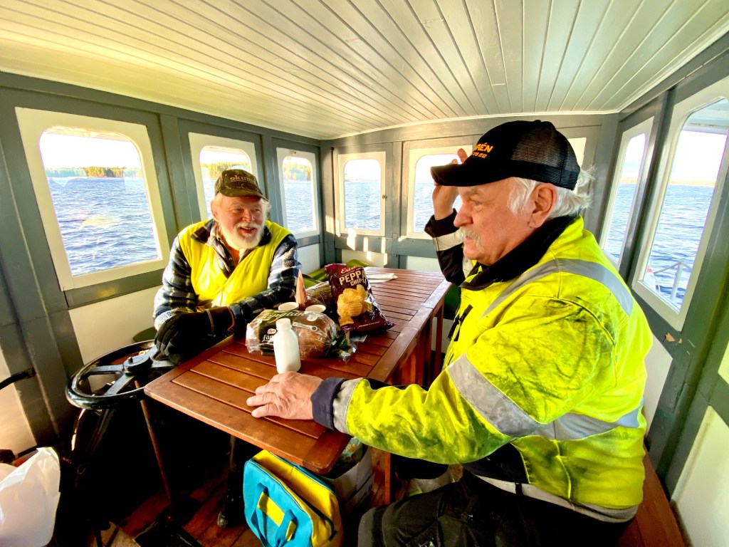 Christina och jag fick möjligheten att följa med flottningsbåten Laxen på en sista tur före vinterns ankring ute vid Sanda båthamn i Mora Noret. Finvädret var beställt av Gösta Frost, det infann sig om än lite blåsigt.