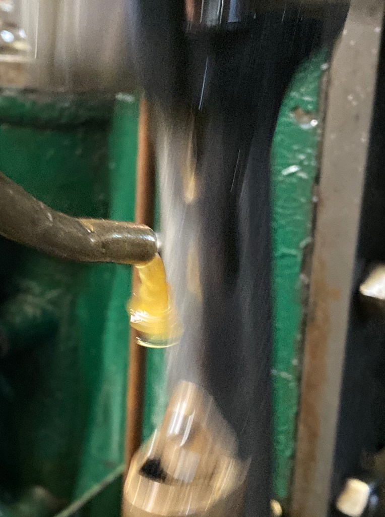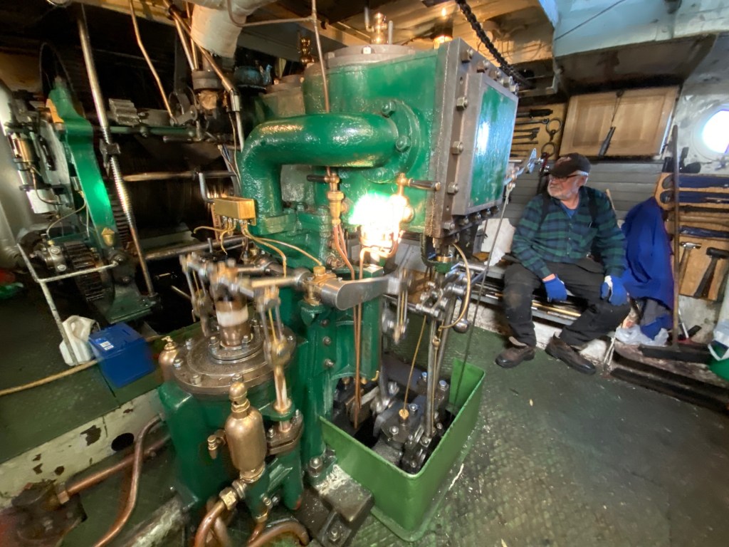 Vi måste åter till maskinrummet där den fina ångmaskinen avger ett behagligt ljud. Efter eldandet som började dagen före var trycket på rätt nivå och det underhölls under färden. Här några bilder från maskinrummet och ”förste maskinist” Lars Aronsson.