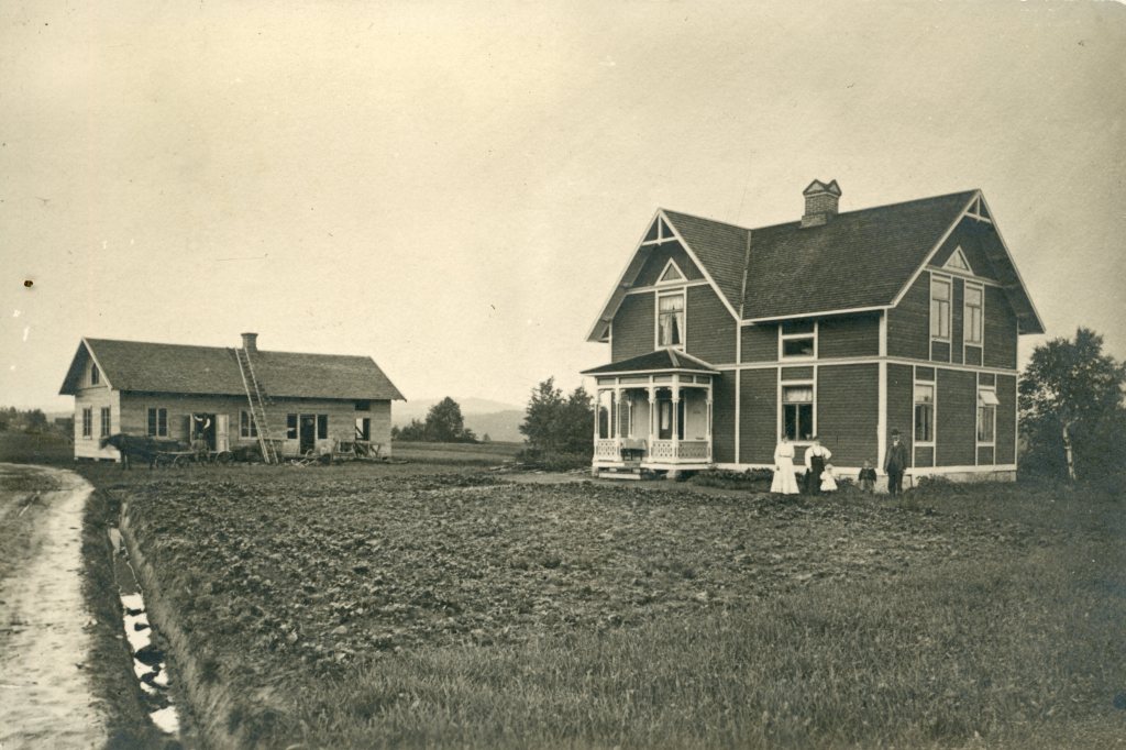 Vävskedsfabriken under uppbyggnad i Oxberg. Huset till höger är bostadshuset där livsmedelshandeln startade. Vasaloppsvägen passerar. Flyttade ut till fabrikslokalen 1915. Min far Carl och hans syster Selma står med farmor Christina och farfar Oskar ute vid gården.