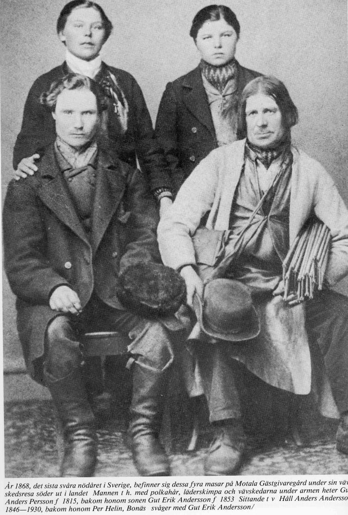 Vävskedar var ju även en av de större binäringarna i Älvdalen och det smittade av sig söderut till Oxberg som sagt. Anledningen till denna lilla ”artikel” är att jag har en så fin bild på min farfars far, Håll Anders Andersson, när han tillsammans med kamrater var på försäljningsresa bl.a. till Motala där de lät fotografera sig 1868. Tidigare visade i ett inlägg, men tål en repris.