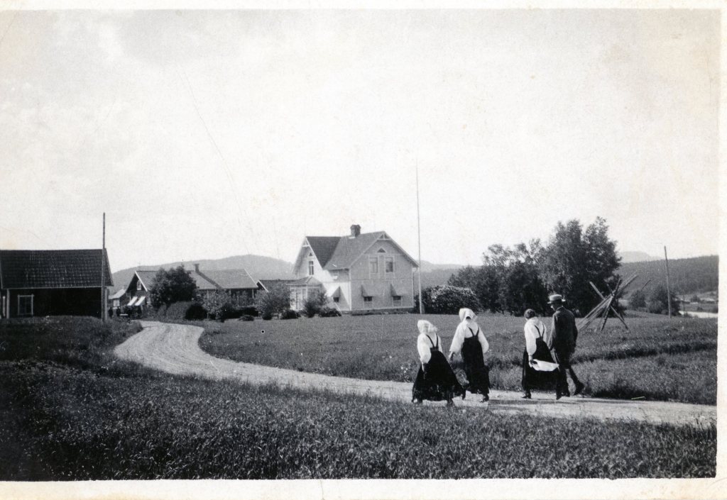 En annan fin bild från samma plats med bostadshuset och lanthandeln. Folk på väg från kyrkan kanske?