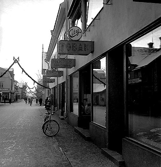 Vi förflyttar oss bort till Vasagatan, Röda Stugan närmast. Där har det varit Café m.m. Även auktionsfirma, står nog det på väggen. Längre fram till höger låg Åbergs slakteri, även bostäder åt familjen Åberg. Längre fram t.v. det kära gamla badhuset som vi besökte ofta. Bassängen var nog 12,5 m lång. Stor på den tiden. Pelle Böhlmark höll koll på oss busungar. Vi badade tills vi var alldeles urlakade. I bastun satt vi och lyssnade på ”gubbarna”, Grin Oskar med flera som skrävlade om sina eskapader.