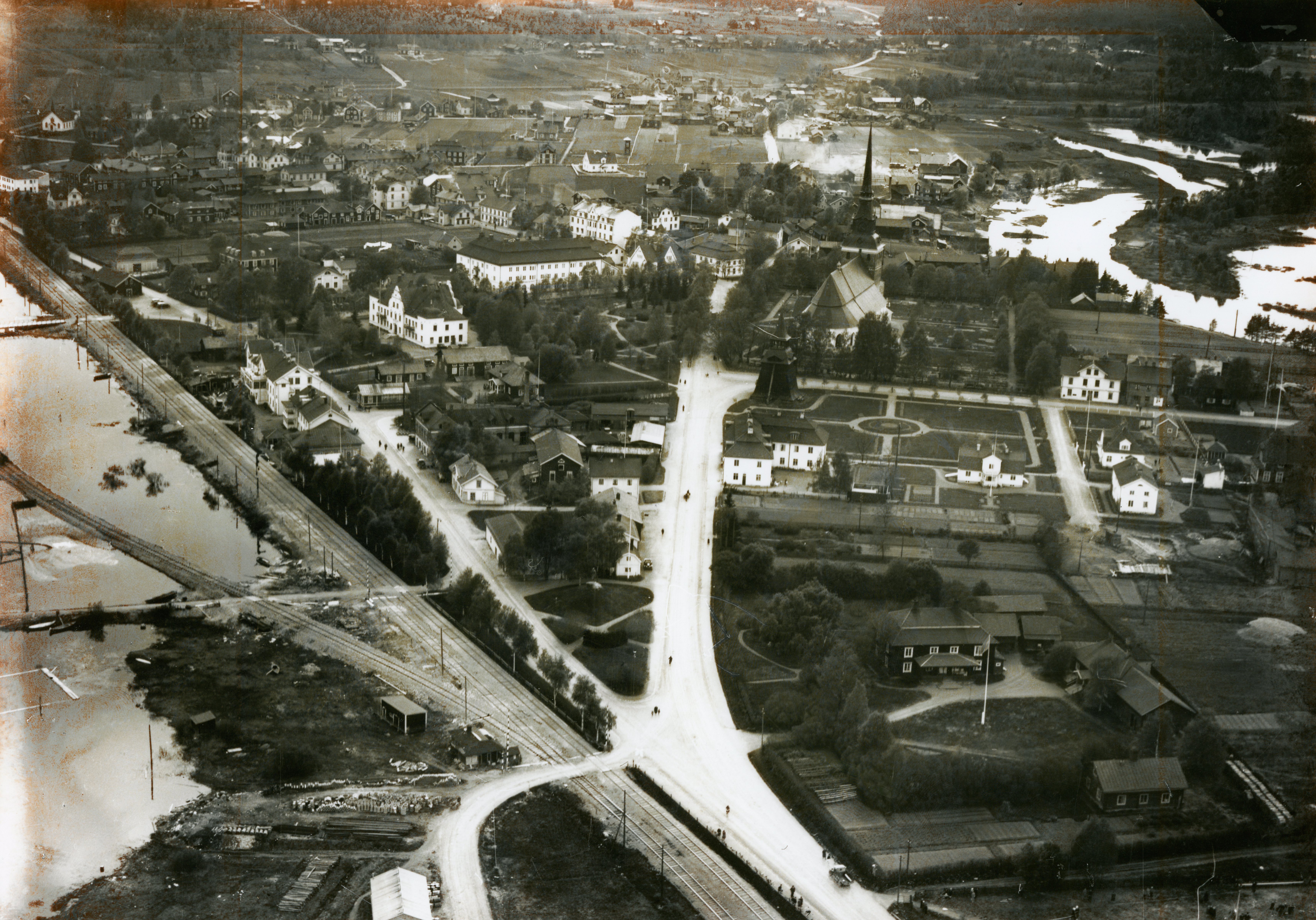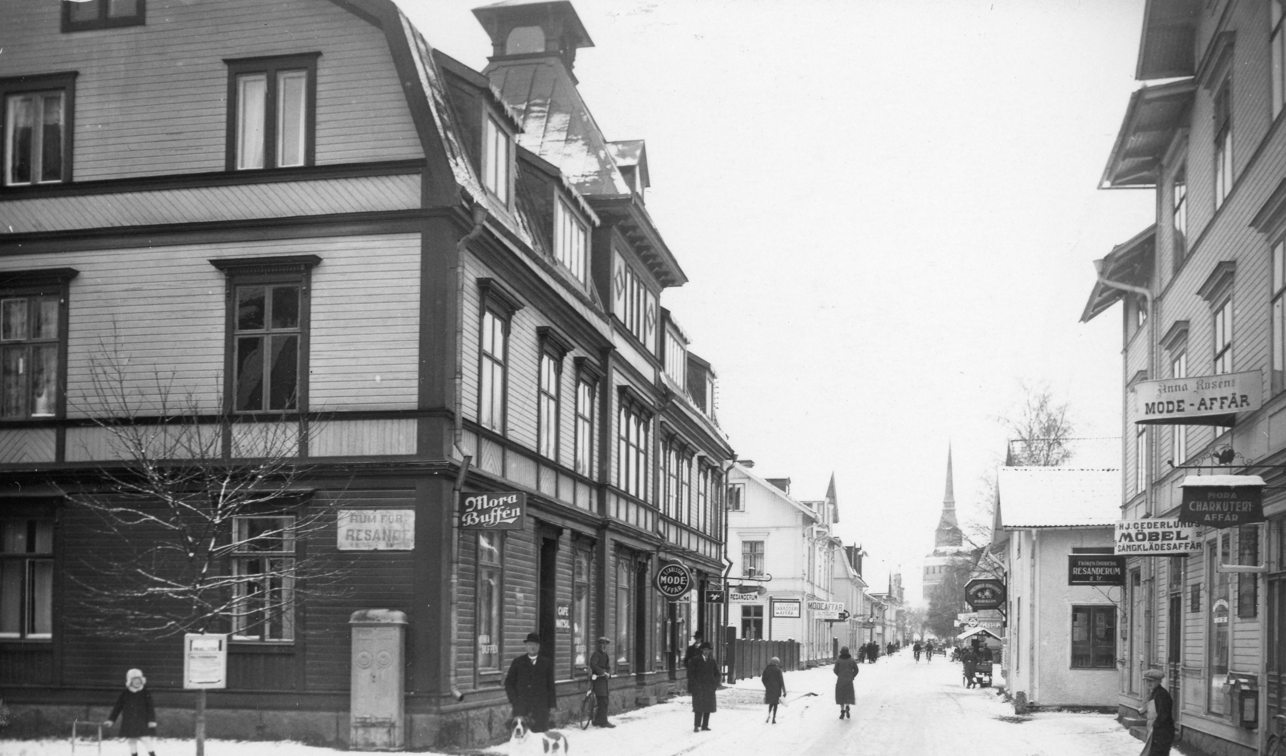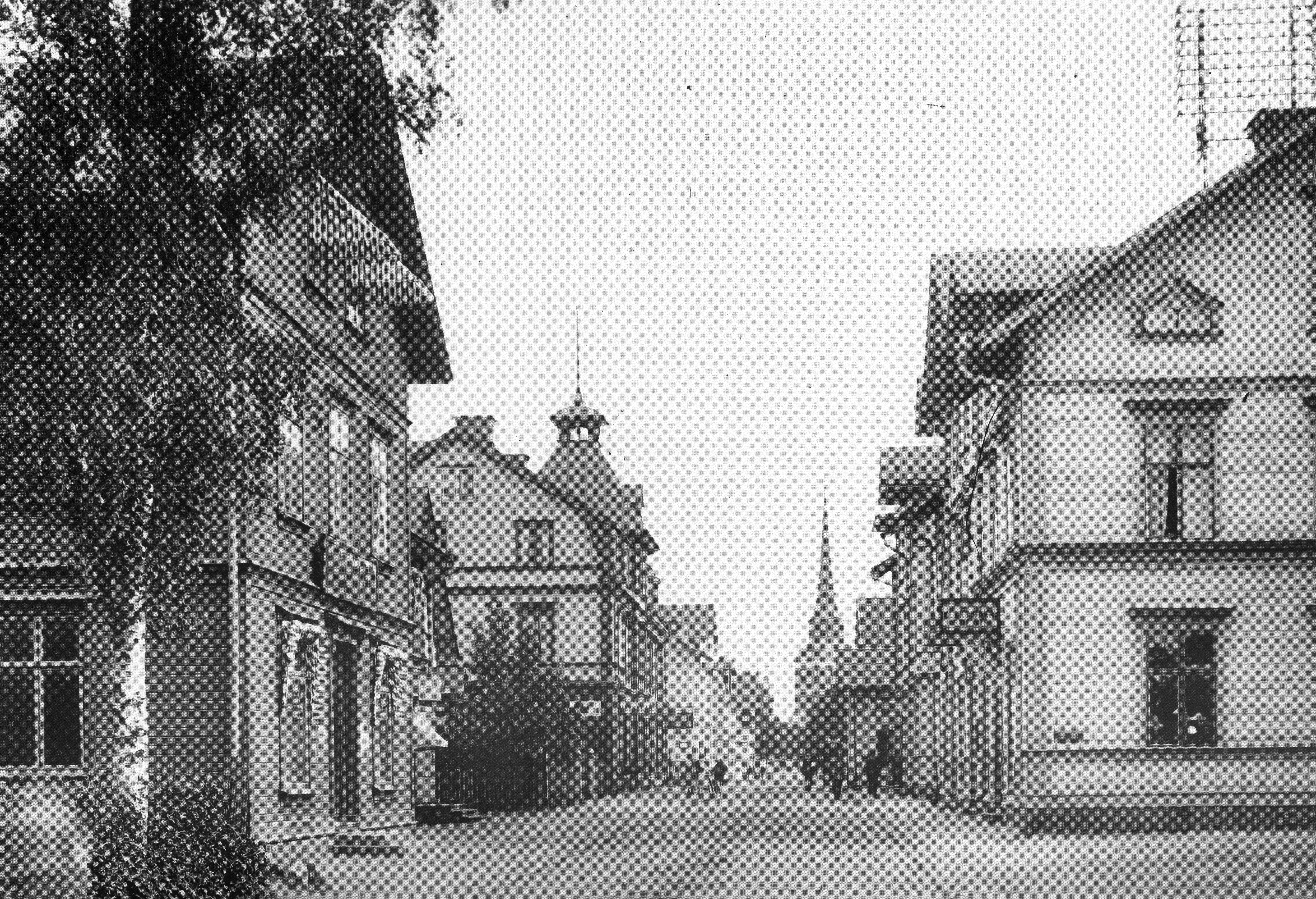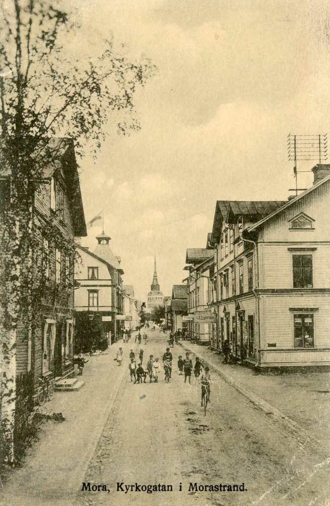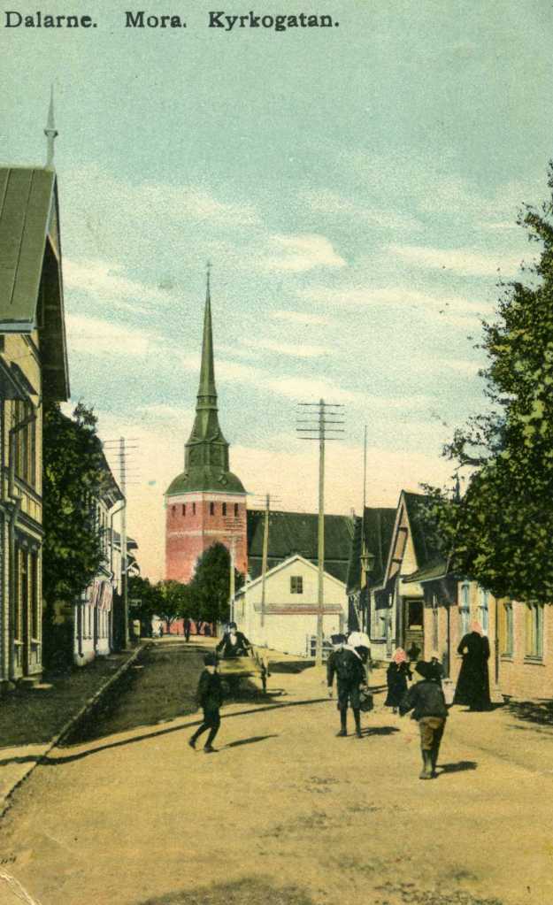Ytterligare en bild från Vasagatan mot kyrkan. Man ser taket på Zornmuseet och Zorngården skymtar fram. Huset med skorsten är det gamla ångbryggeriet som rymde Sagabiografen mot slutet innan det revs och gav plats för nya Lisselby. Det stora trähuset var ett affärs- och bostadshus. Swanströms Elbyrå m.fl. höll till där.