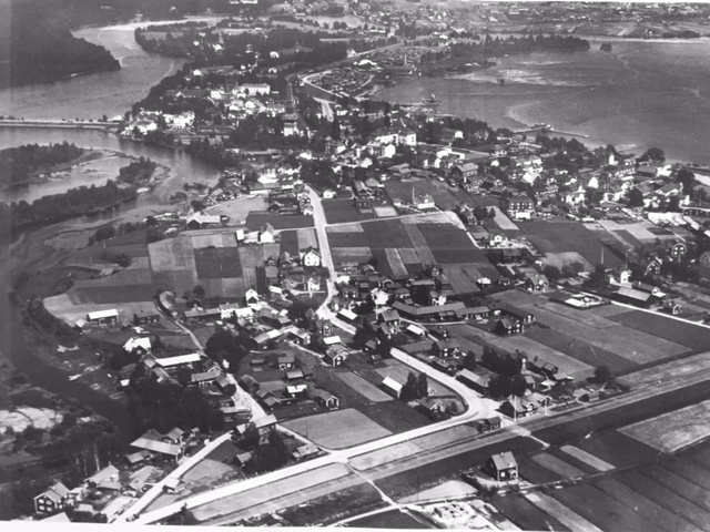 Så här såg det ut nere mellan järnvägen och Saxviken innan där fylldes ut. Till vänster låg Ströms sågverk där man nyligen sanerat marken. Det fanns två pilträd därnere som vi höll till vid. Framförallt det stora där vi hade ett ”tillhåll” uppe på en av de stora grenarna. Ett slags ungdomars mötesplats, ett modernt ord numera. Rakt fram ser vi Stahrbo och till höger därom BP-macken med Gunnar Blomberg. I det s.k. tidningshuset till höger bodde familjen Böhlmark.