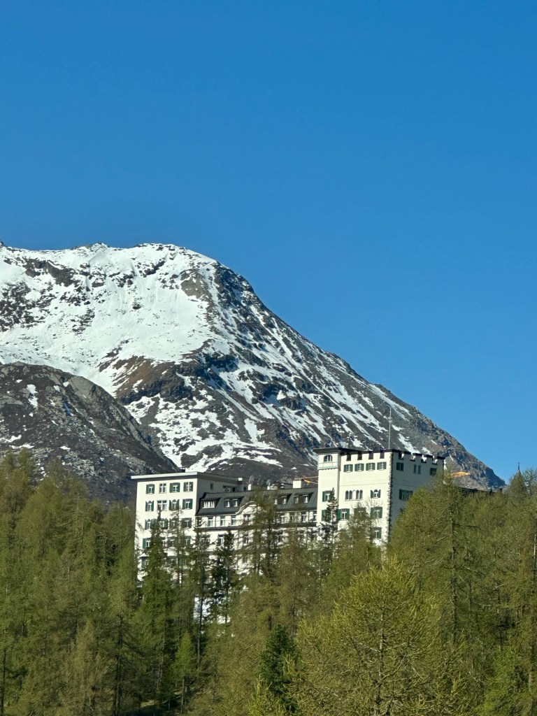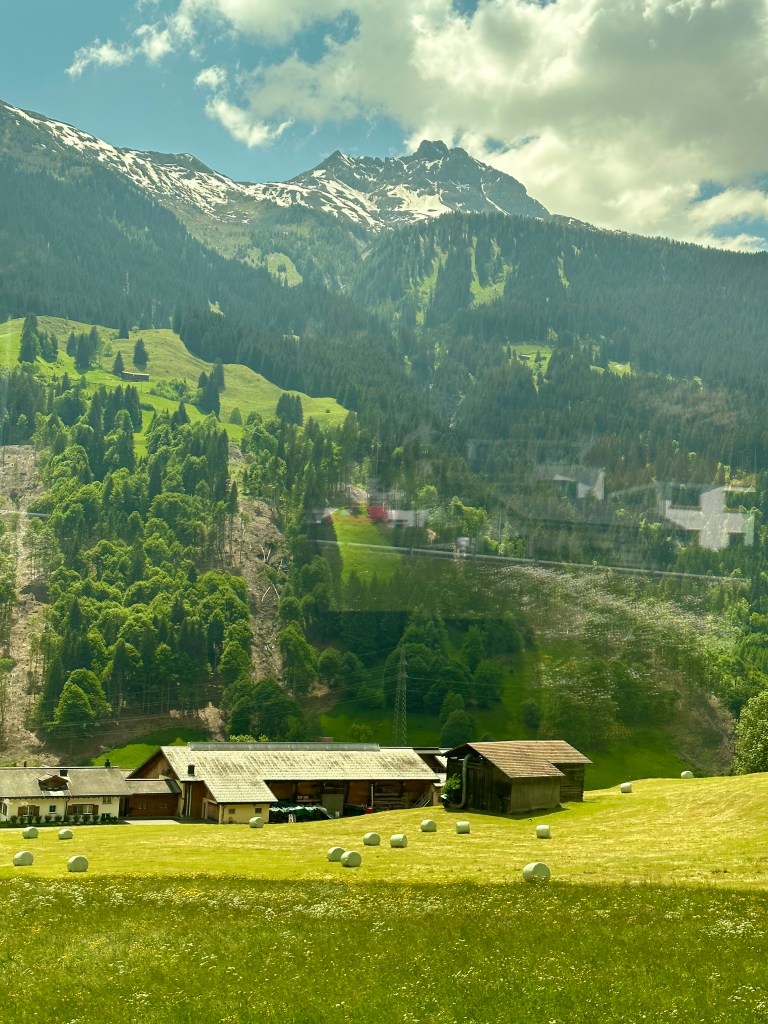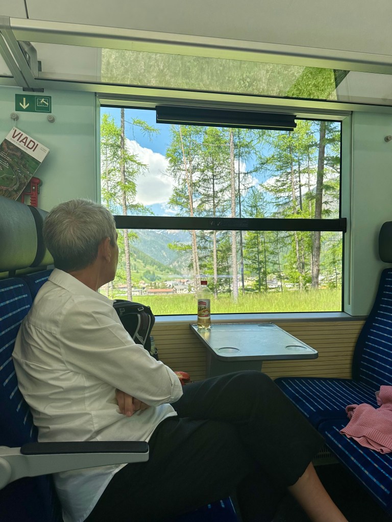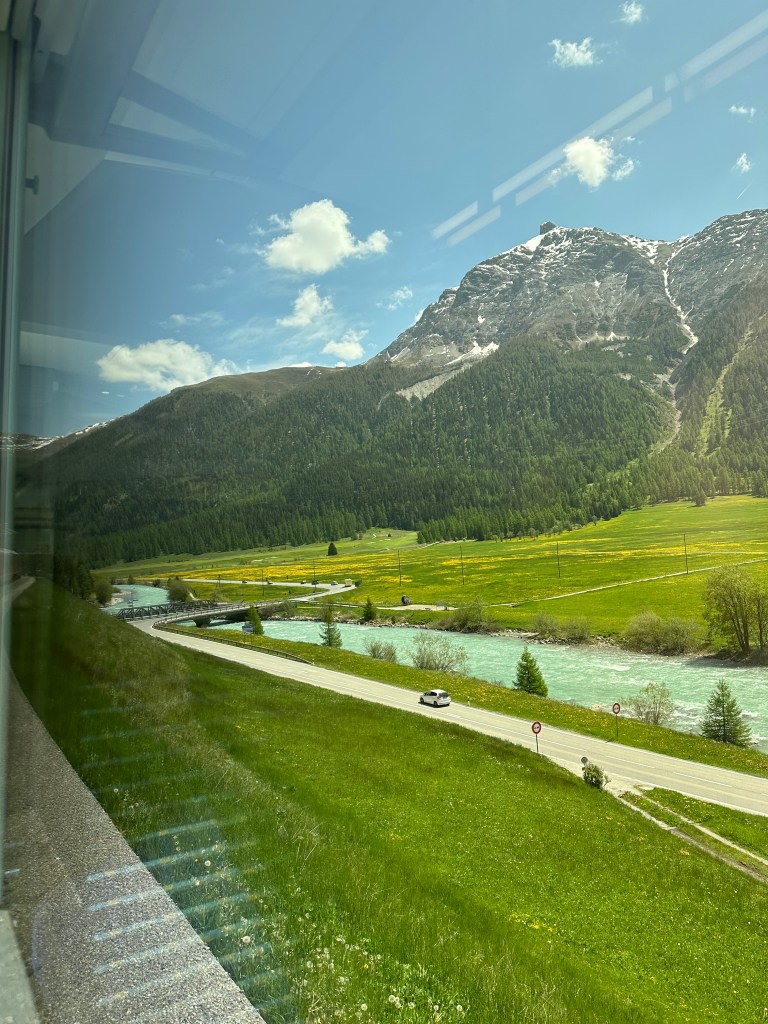 Vi Landade i Zürich och tog tåget med det trevliga Rhätische Bahn. Det röda tåget ringlar sig uppöver bergen, in och ut ur tunnlar och över berg och ner i dalar. En tågresa med njutning.