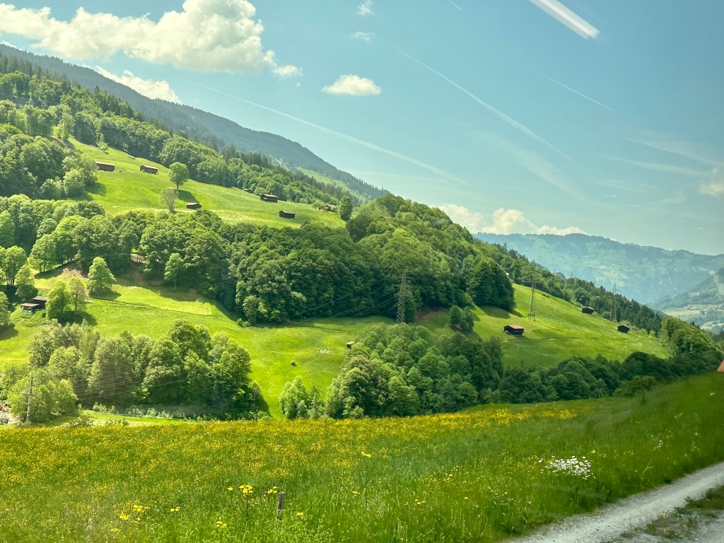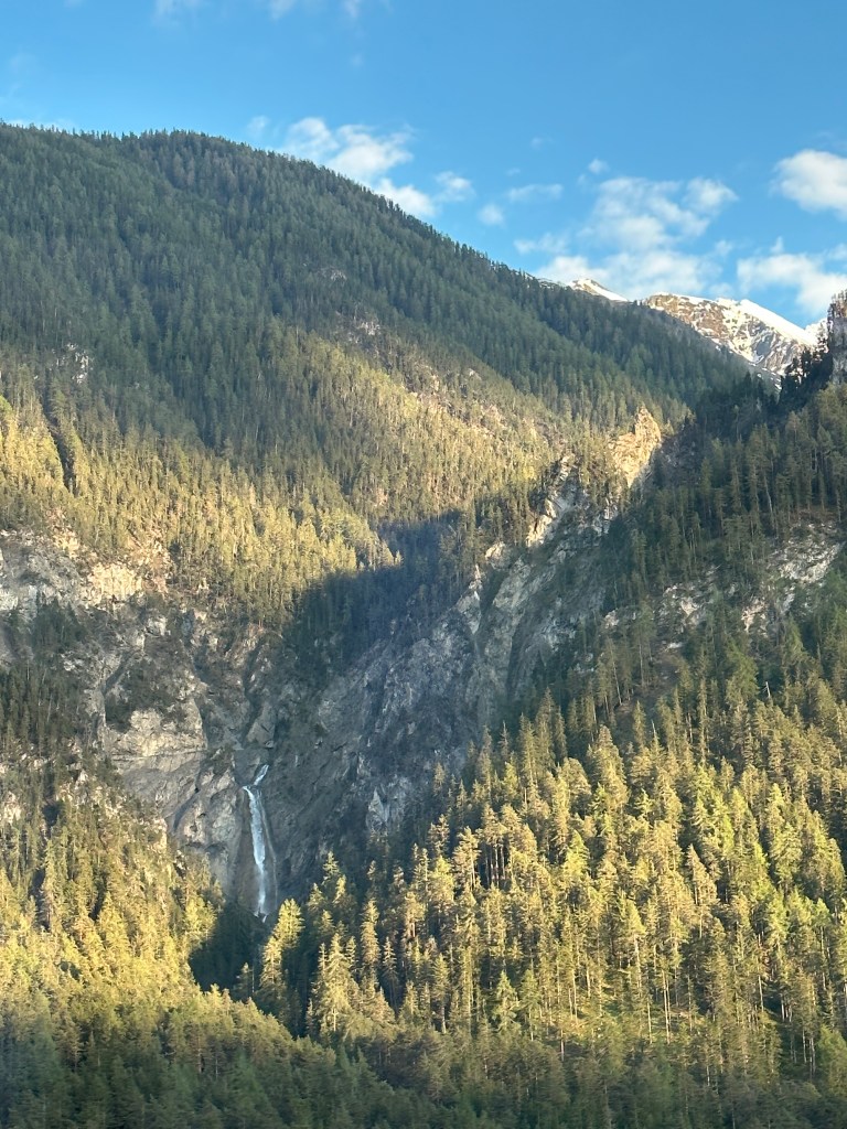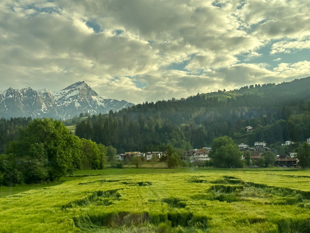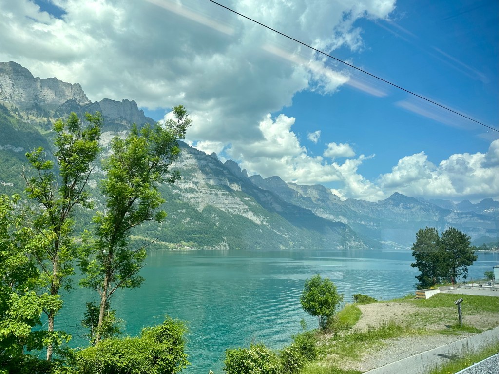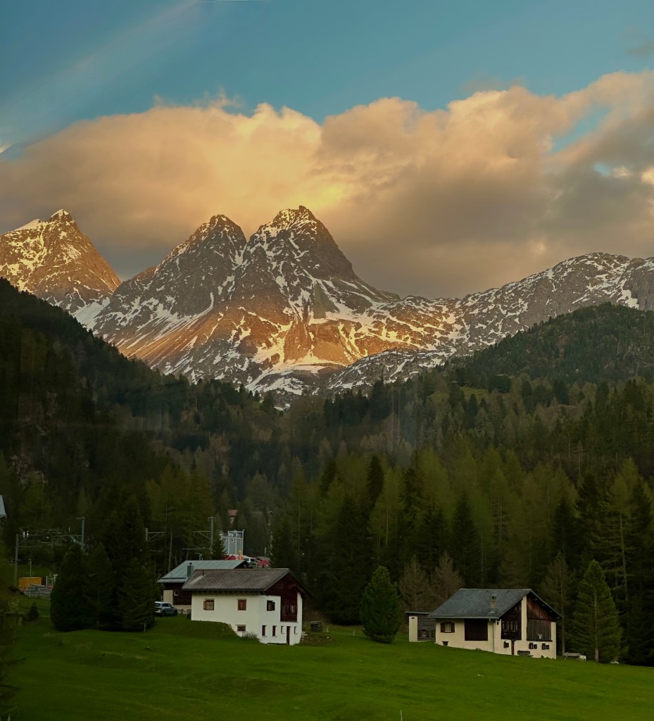 Vi Landade i Zürich och tog tåget med det trevliga Rhätische Bahn. Det röda tåget ringlar sig uppöver bergen, in och ut ur tunnlar och över berg och ner i dalar. En tågresa med njutning.